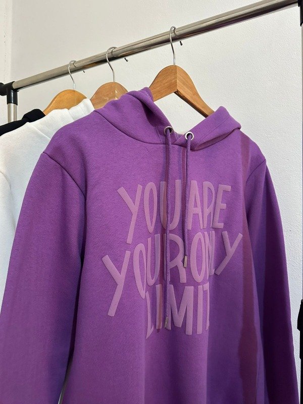 • Buzo unisex frisado con frase en relieve.