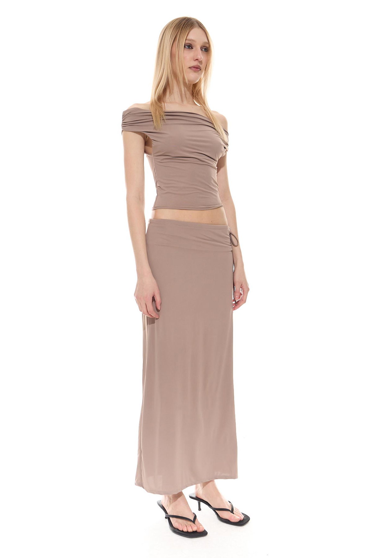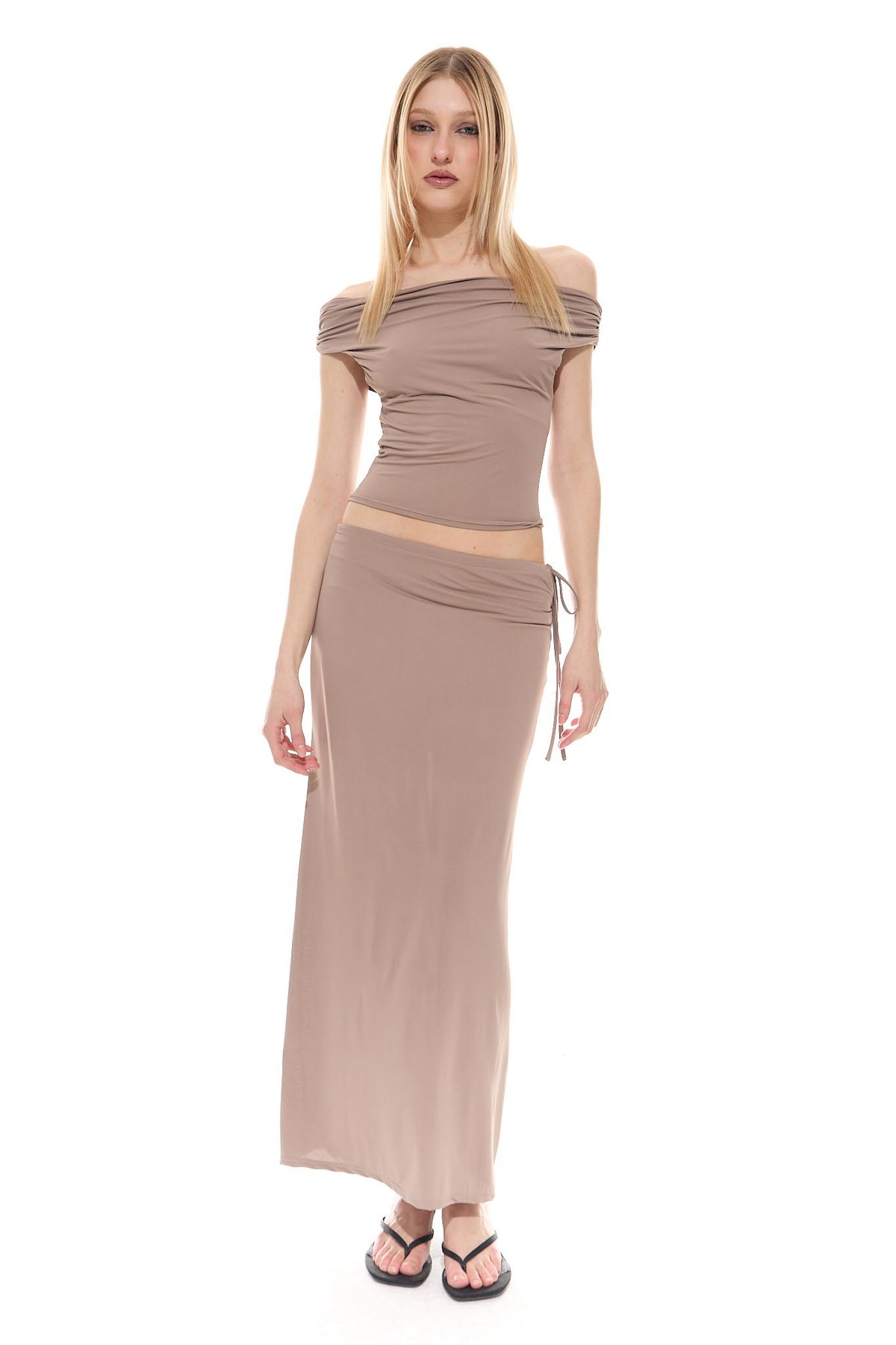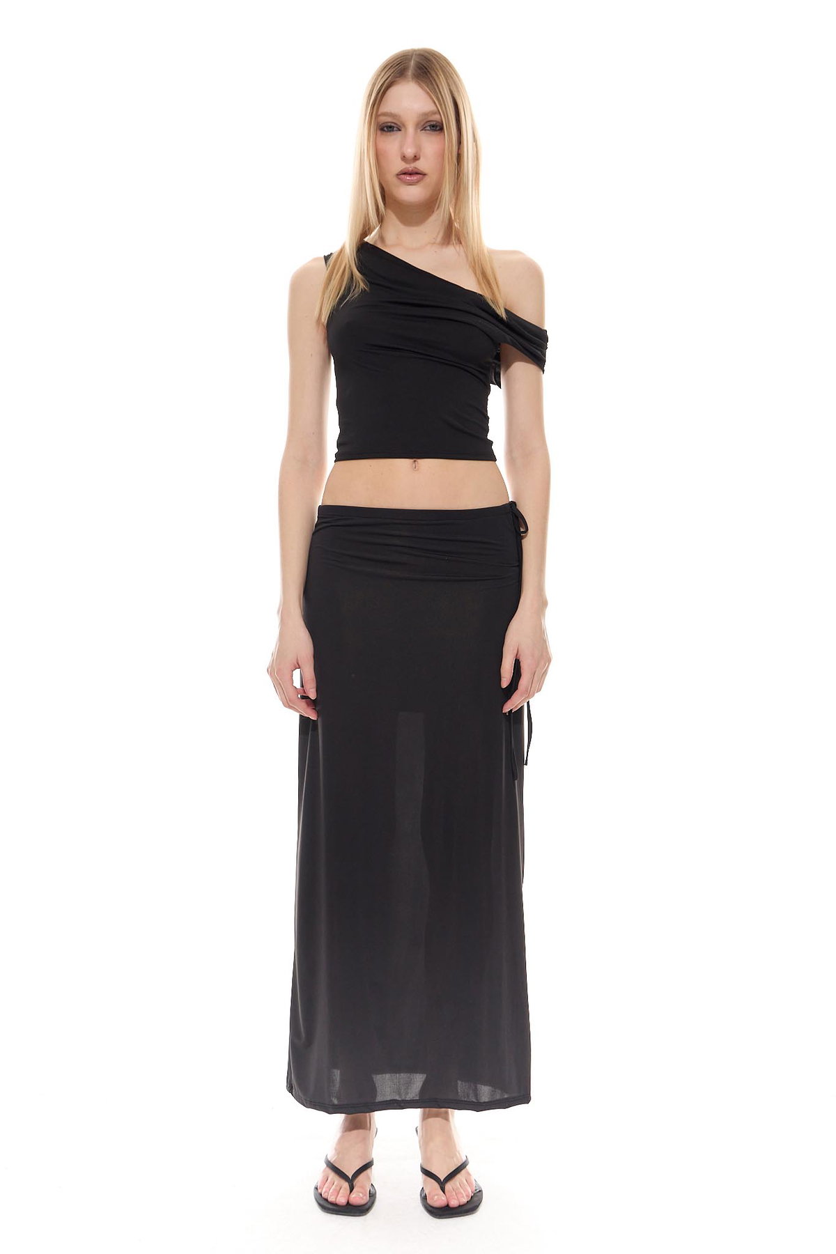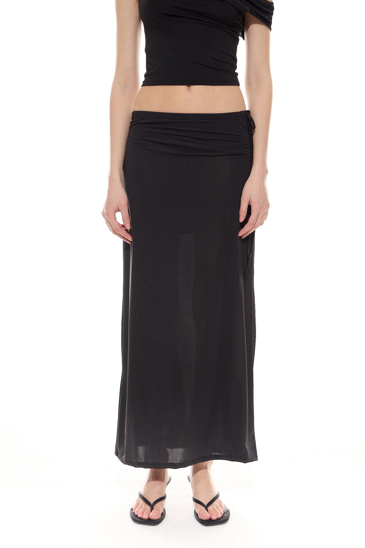 • Pollera larga fluida y de tacto fresco, con forrería y tira para ajustar en cintura, hecha de microfibra liviana con spandex.
