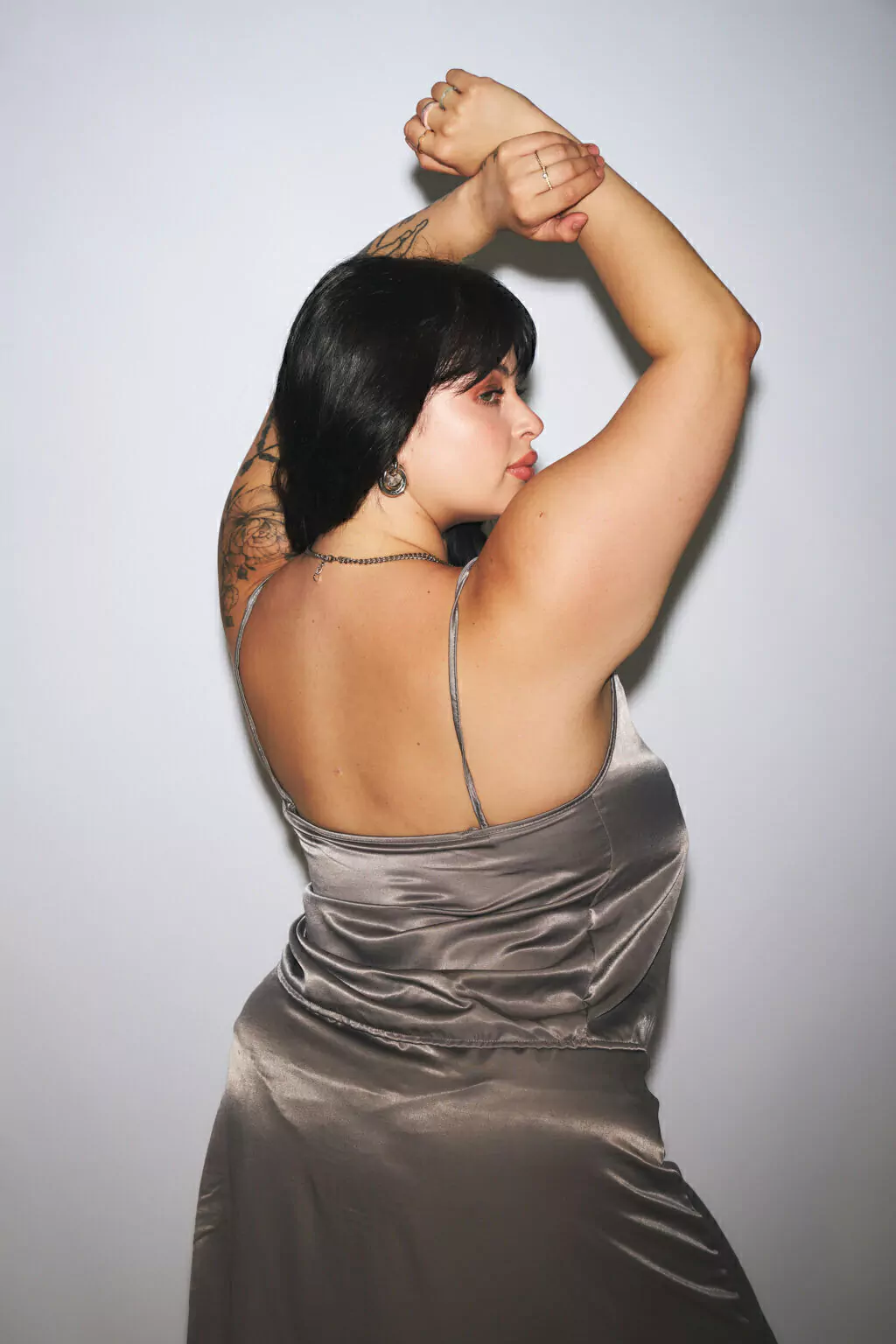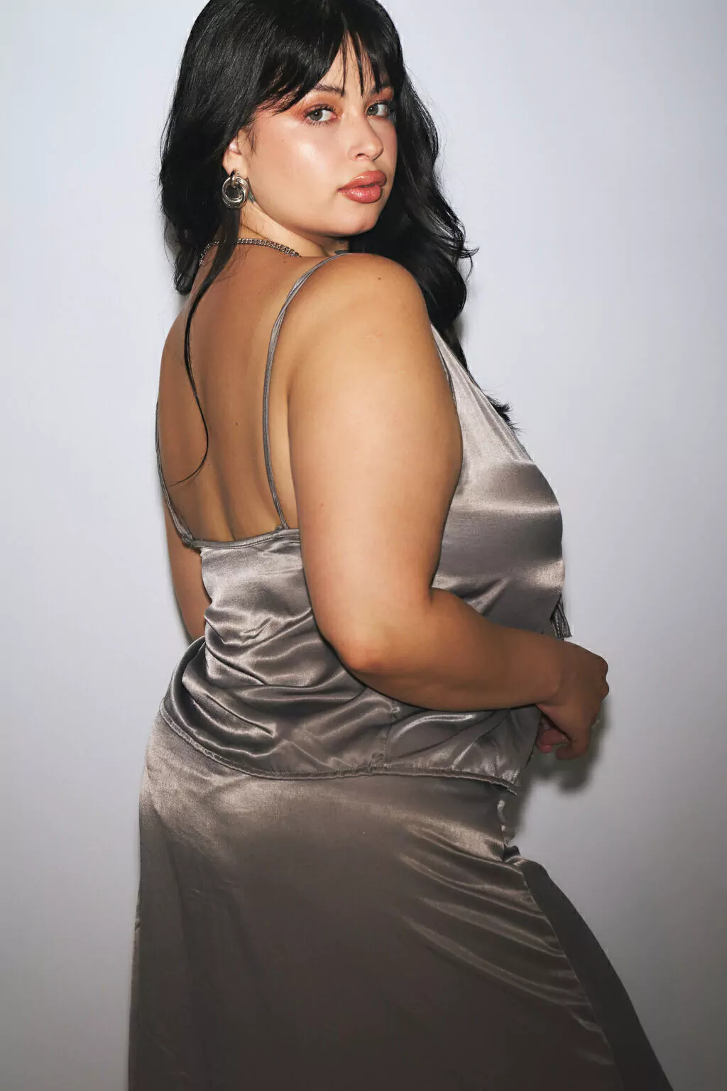 • Top de sedita con tiras para atar y falda de sedita con elastico en cintura y tajo lateral.