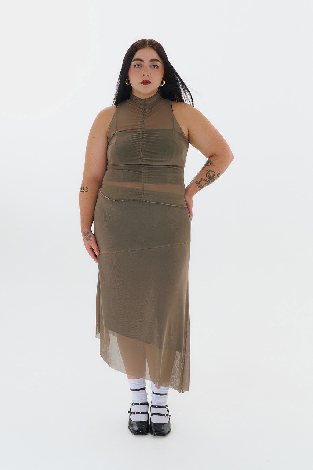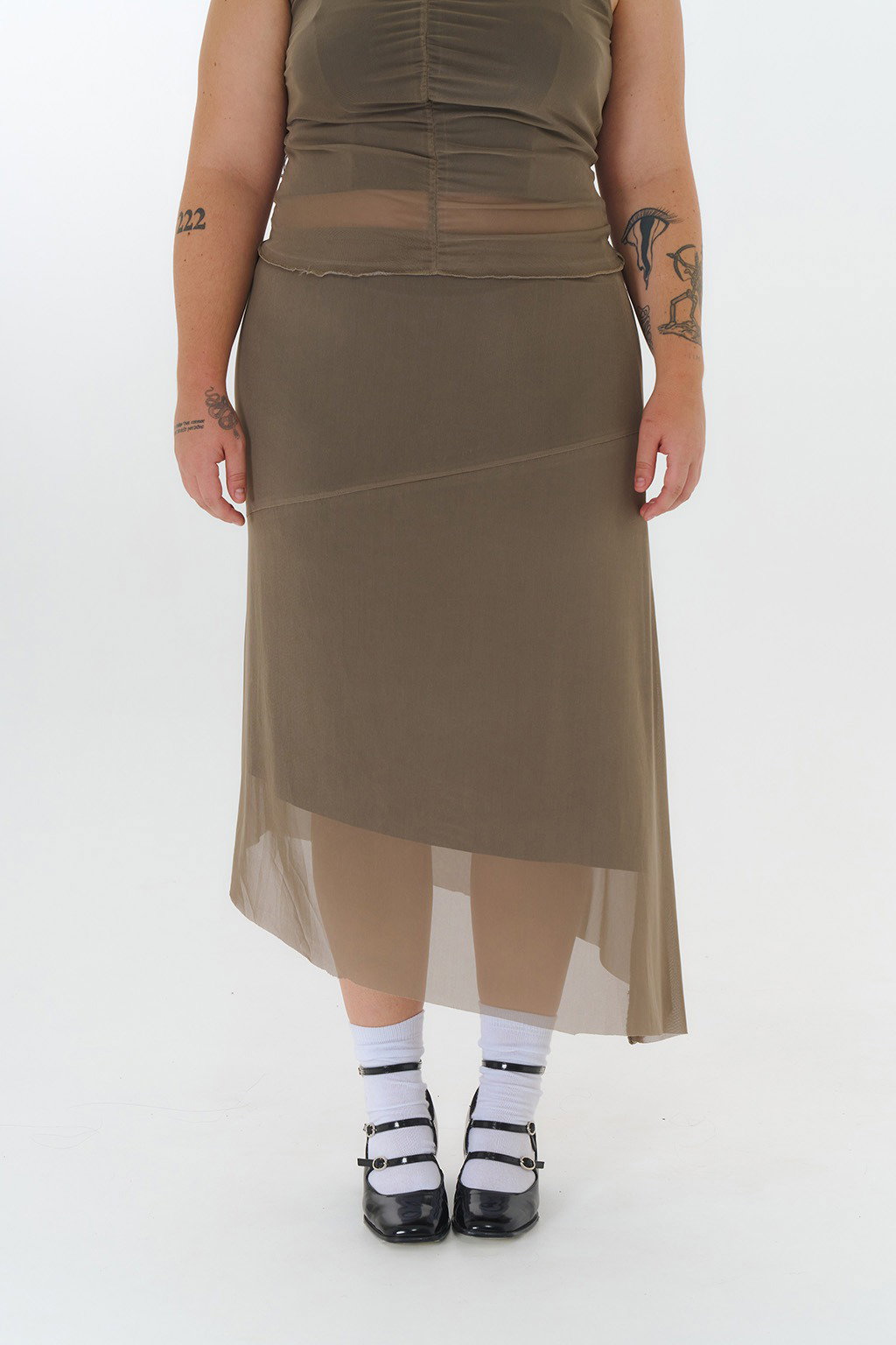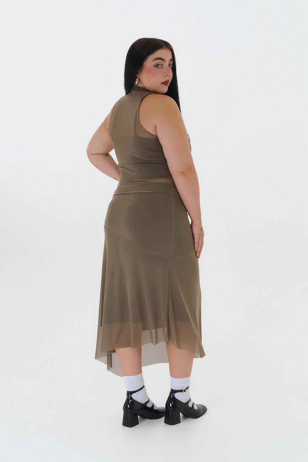 Falda midi asimetrica con recortes. Tiene forreria interna y elastico en la cintura