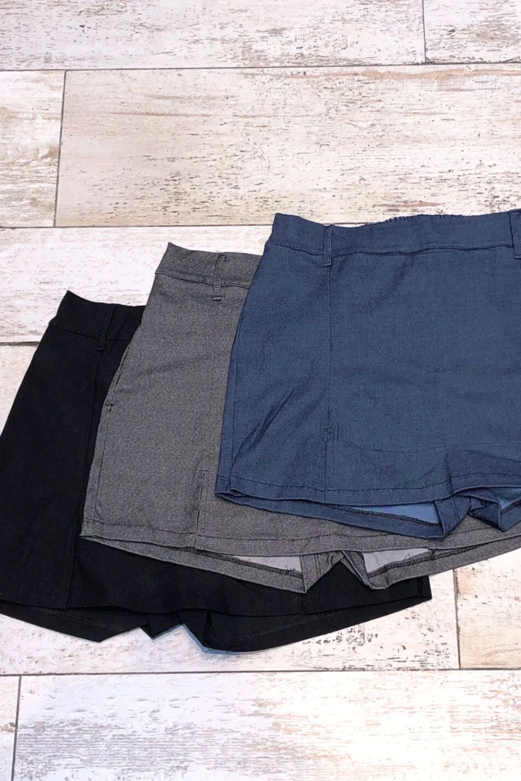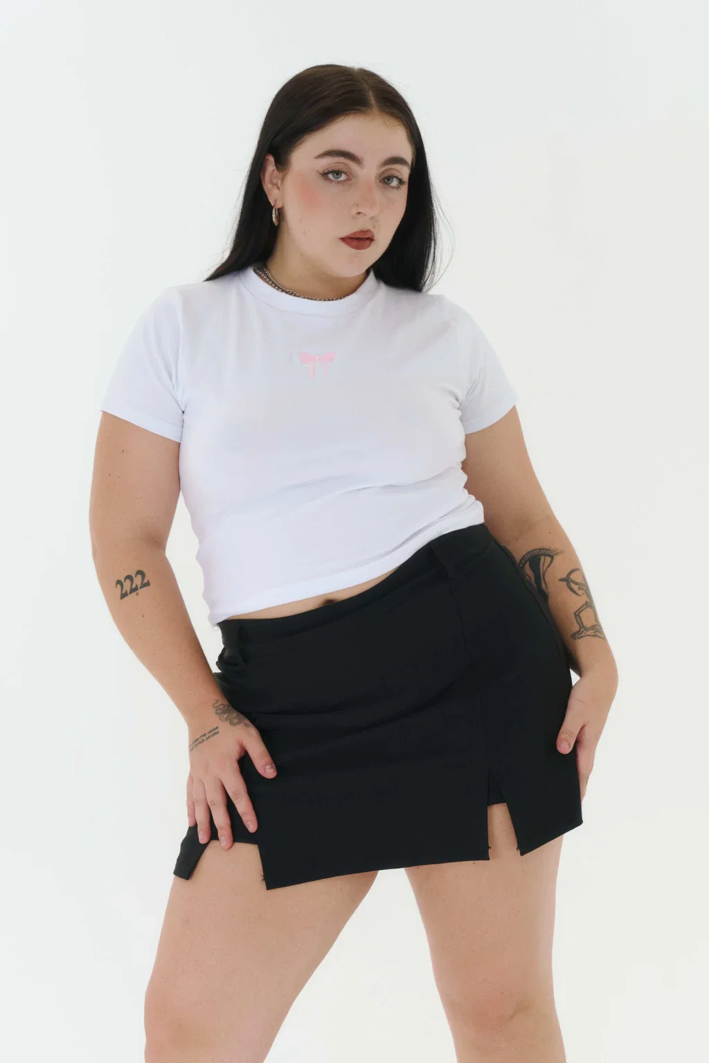 • Skort de bengalina con tajos y elastico espalda. Tiene pasacintos en la delantera y en la espalda.