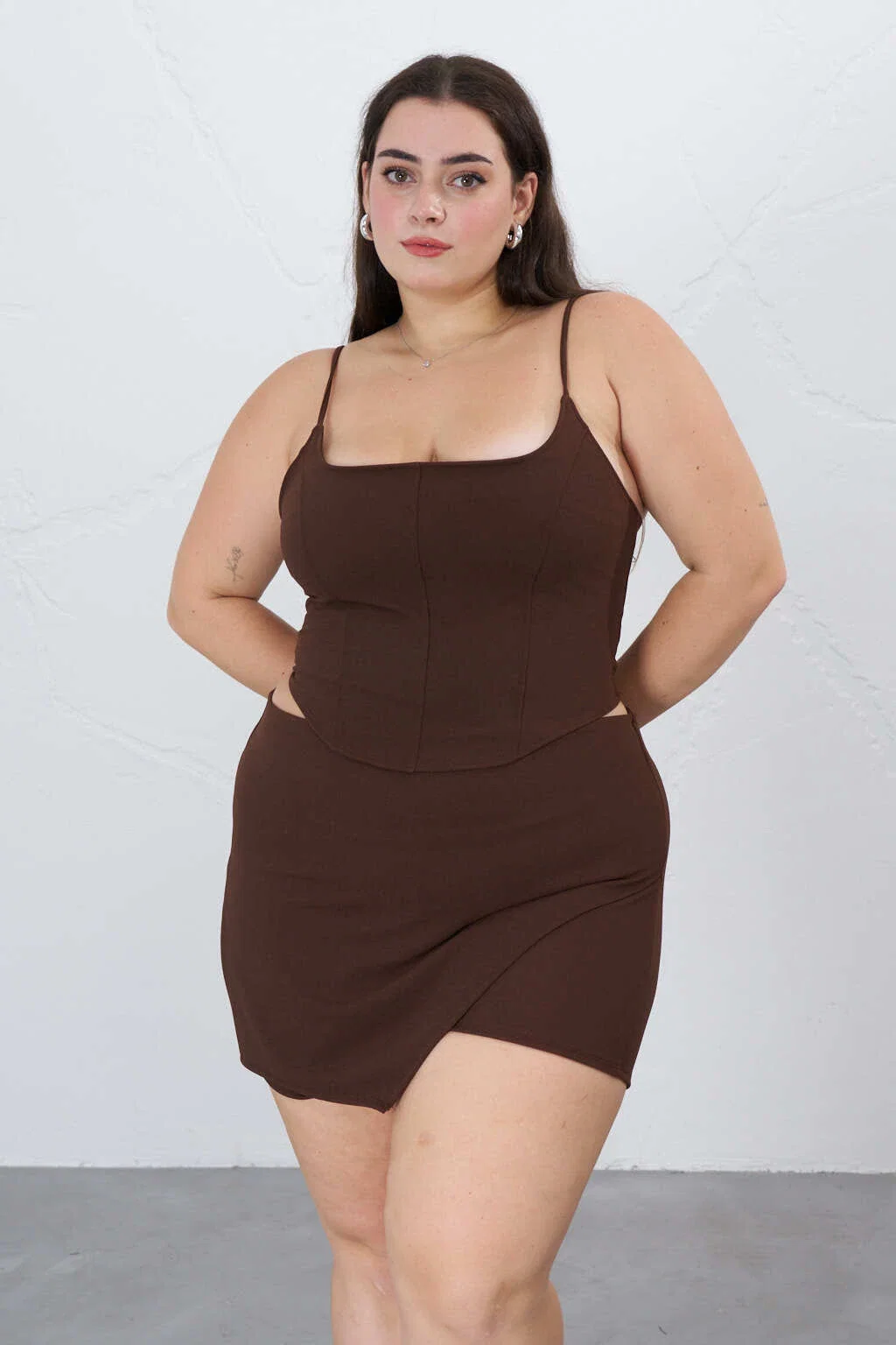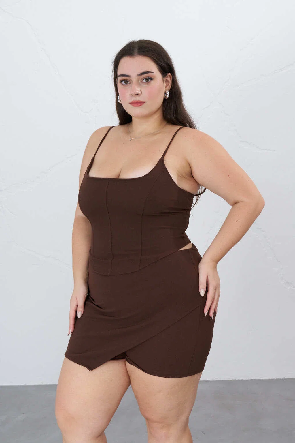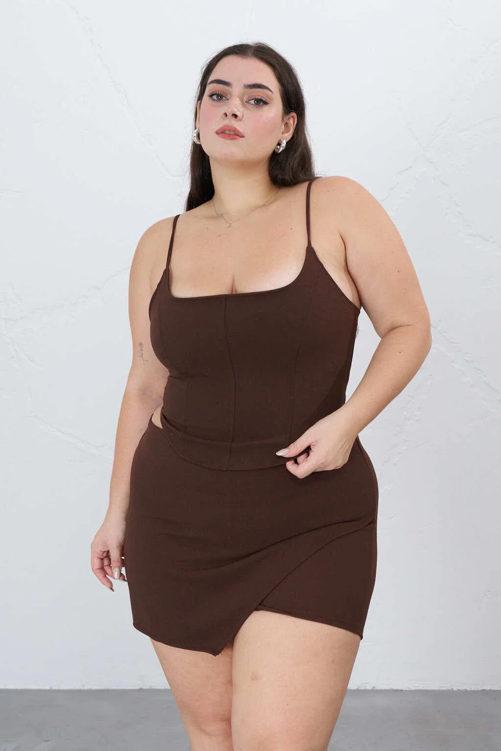 • Skort de crep con corte asimetrico. La modelo usa talle 44.