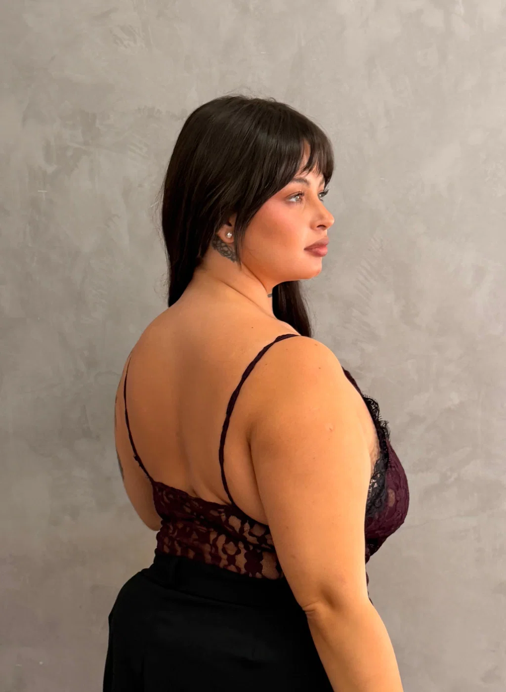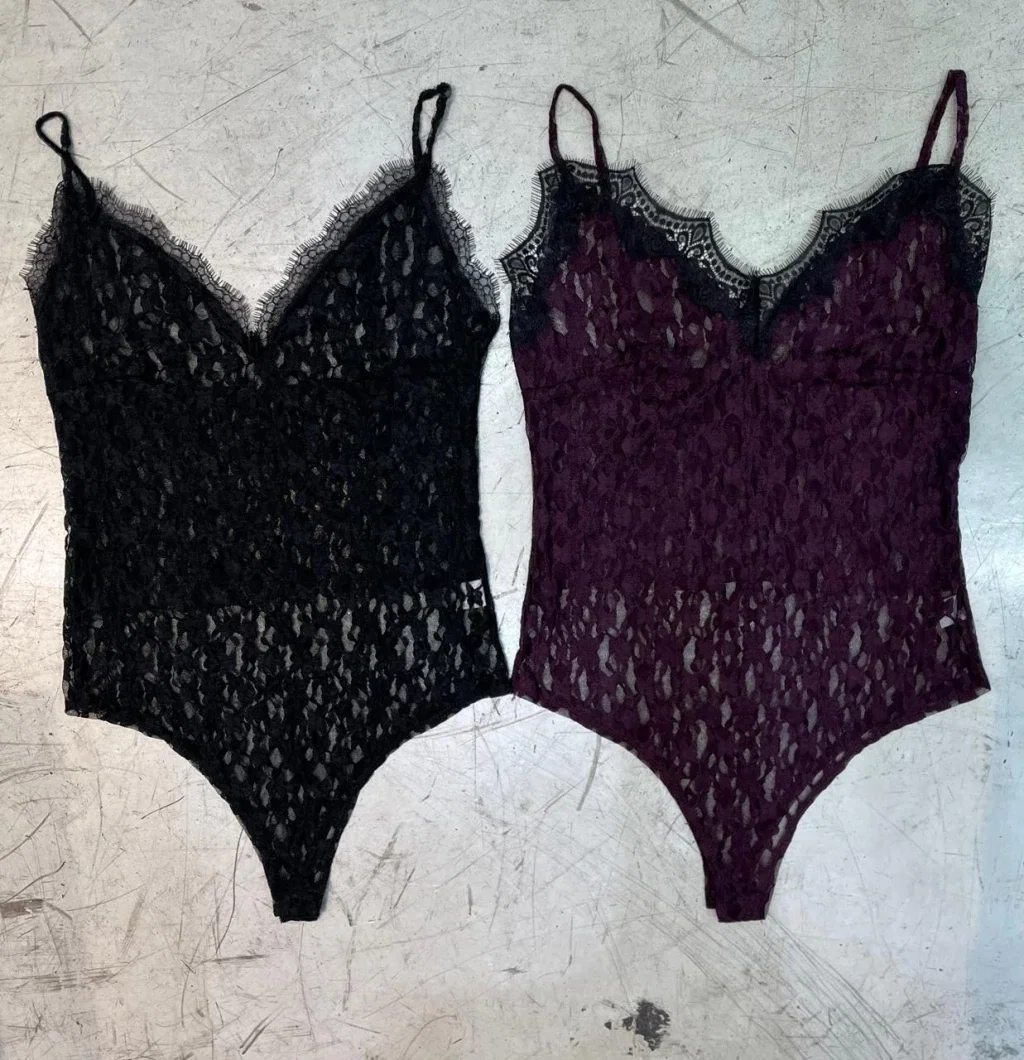 • Body de encaje escote V con puntillas decorativas. Tiene ganchos en el tiro.