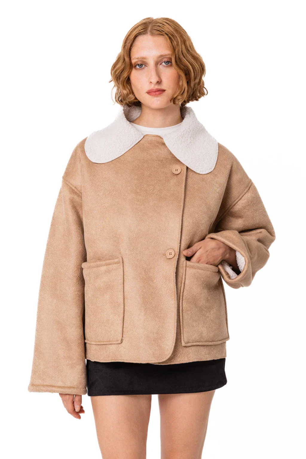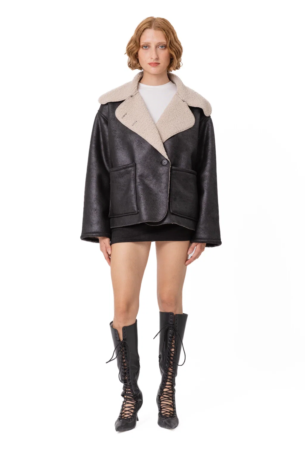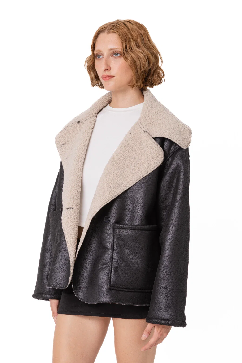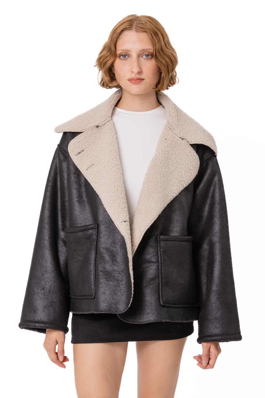 • Campera de abrigo gamulán de cuerina con boton y bolsillos de corderito. Reversible.