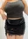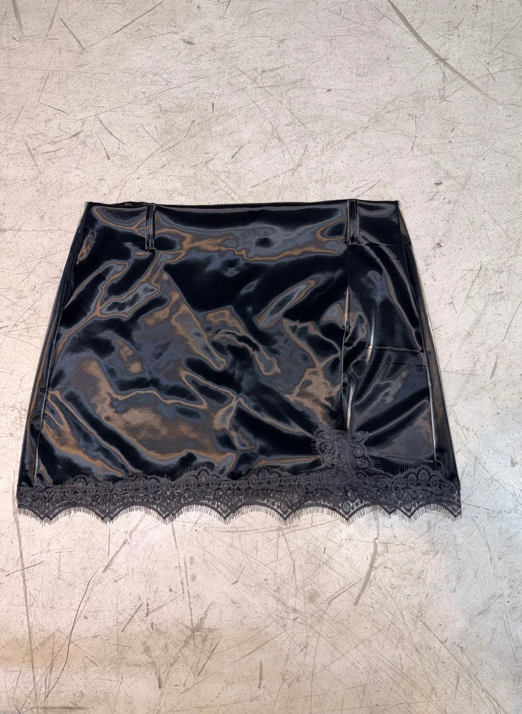 • Mini de cuerina tornasolada con vista velvet, tiene puntillas decorativas y cierre trasero. La modelo esta viste talle 46.