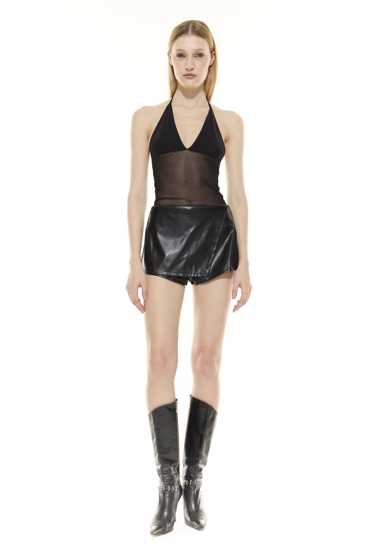Short pollera de cuerina con tapa delantera.