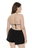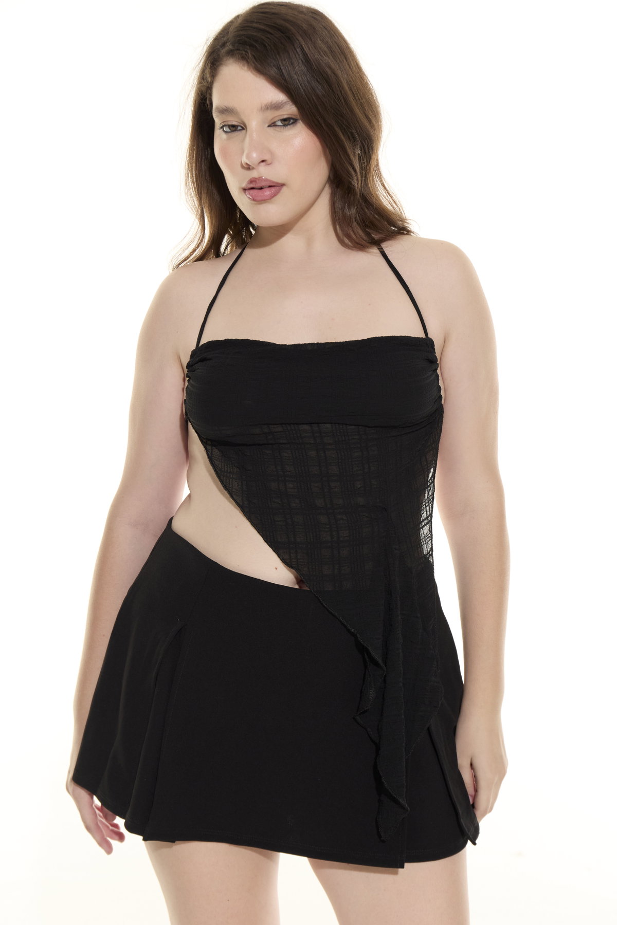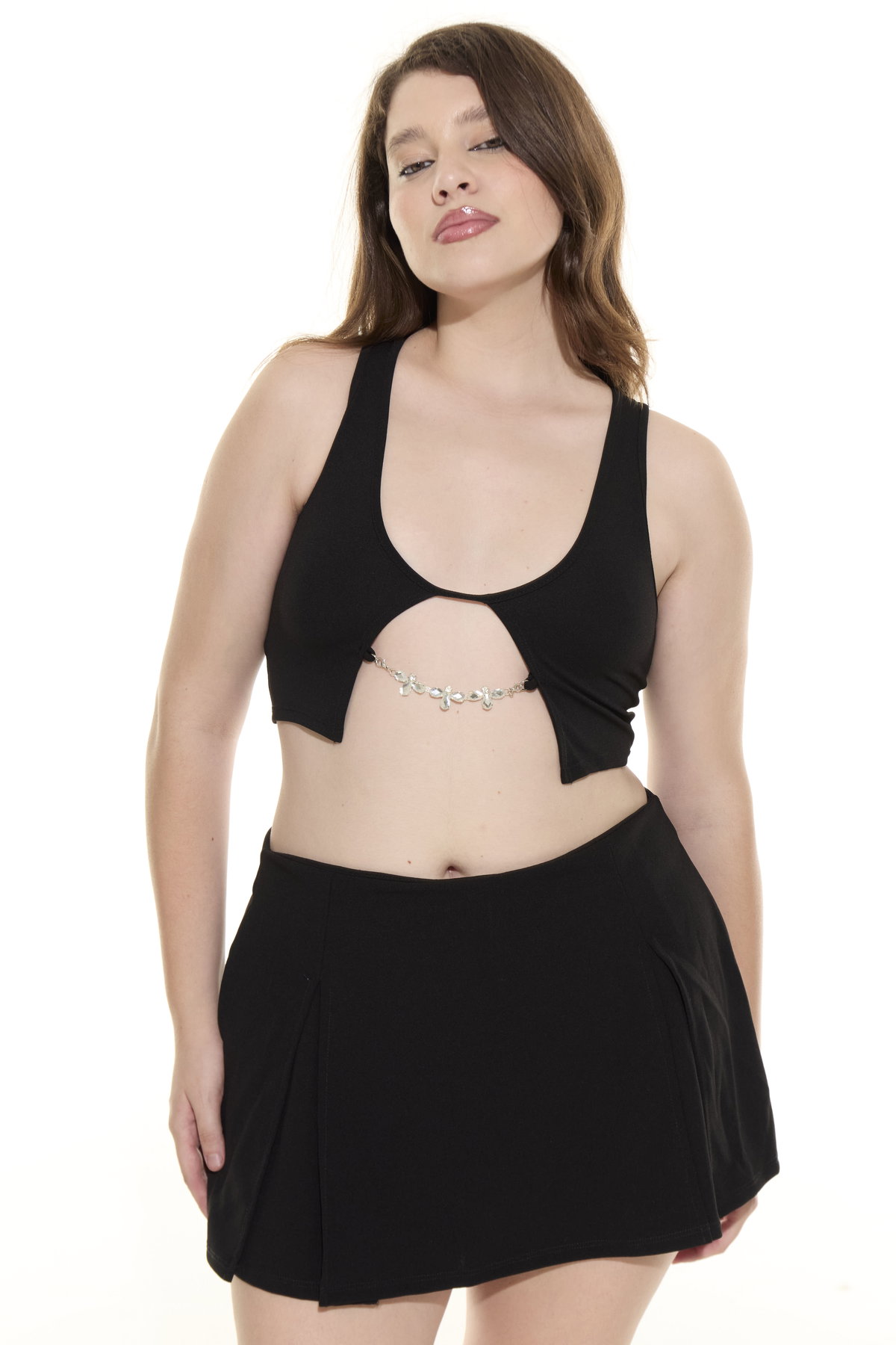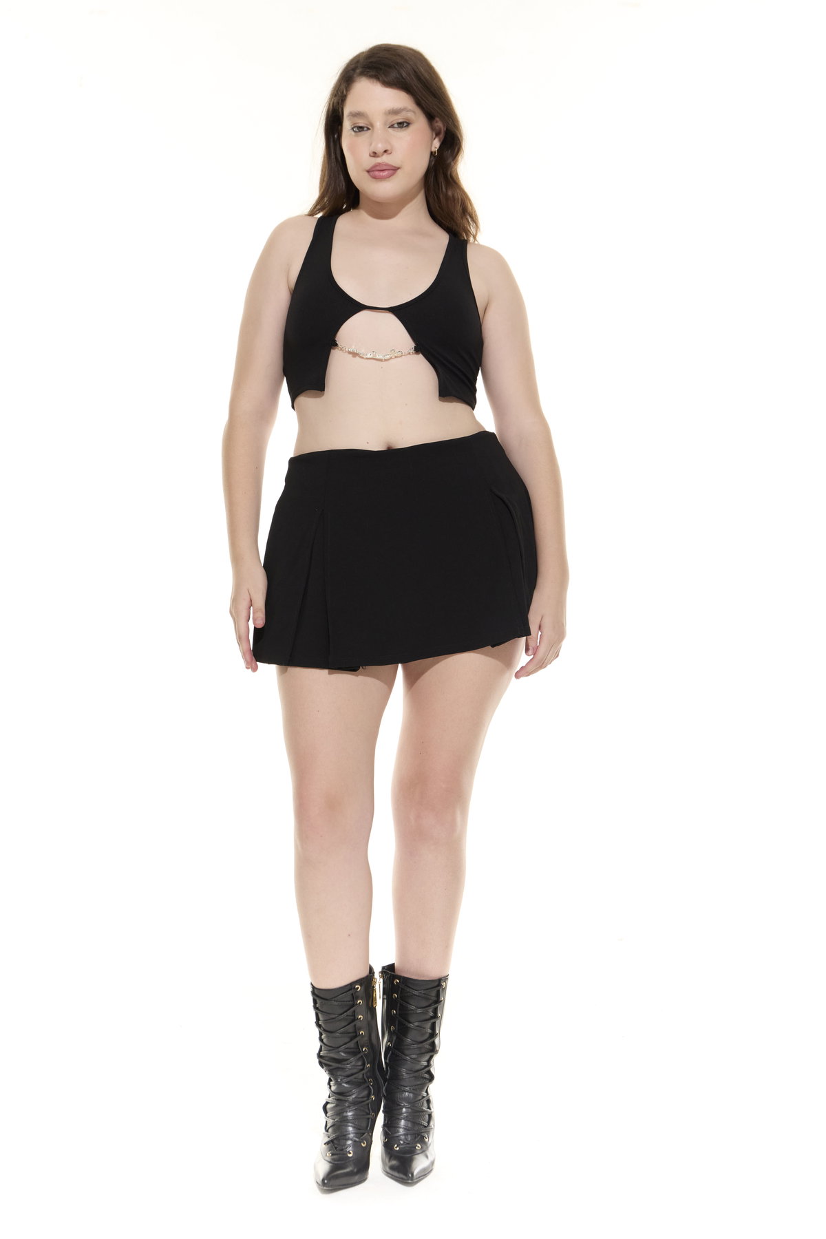 • Short pollera de crep con tablas delanteras y cierre por detras.