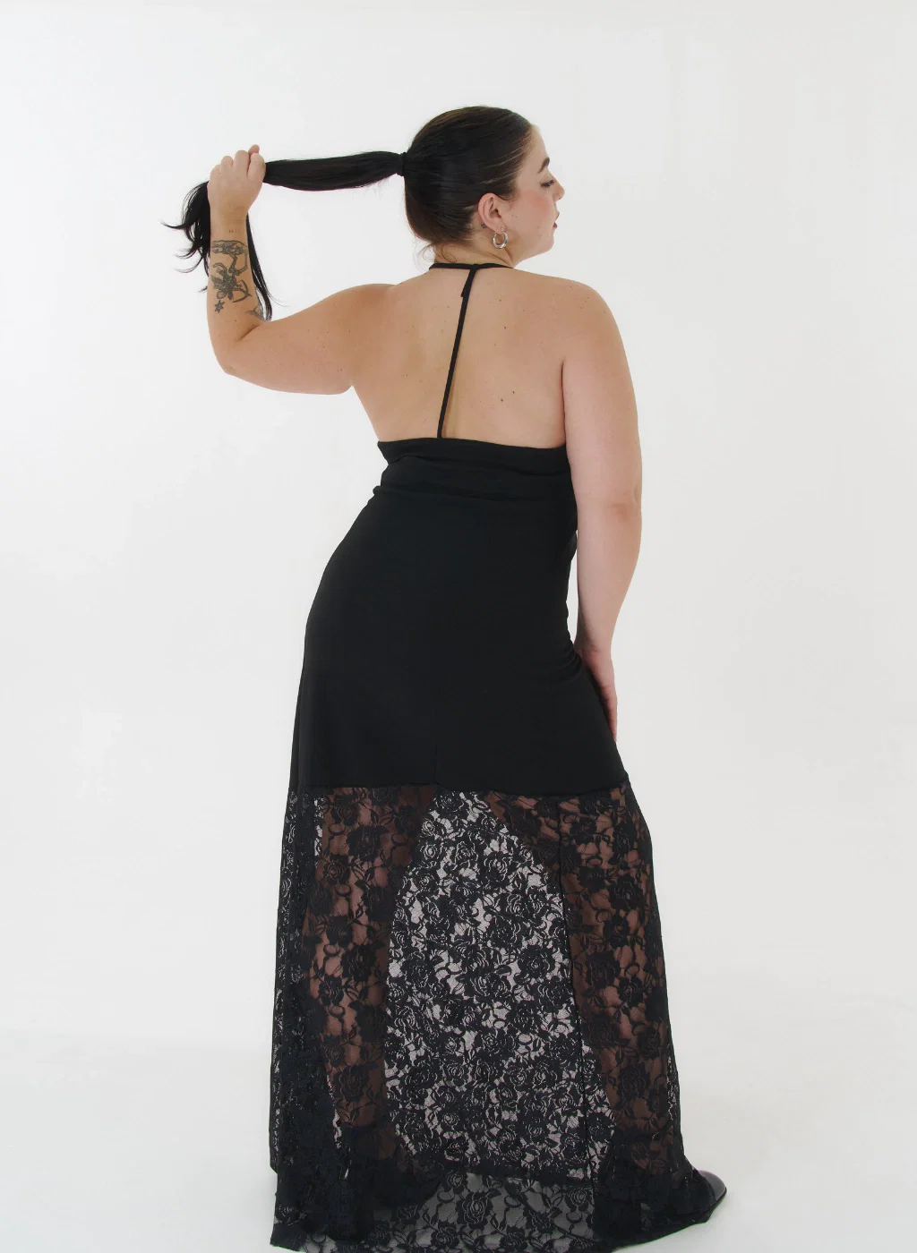 • Vestido largo de crep con encaje. Elastiza hasta 1 talle. El encaje no elastiza