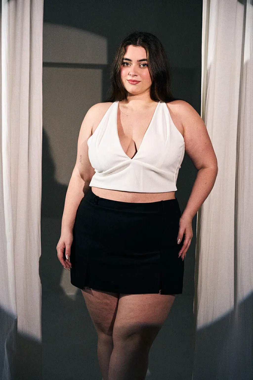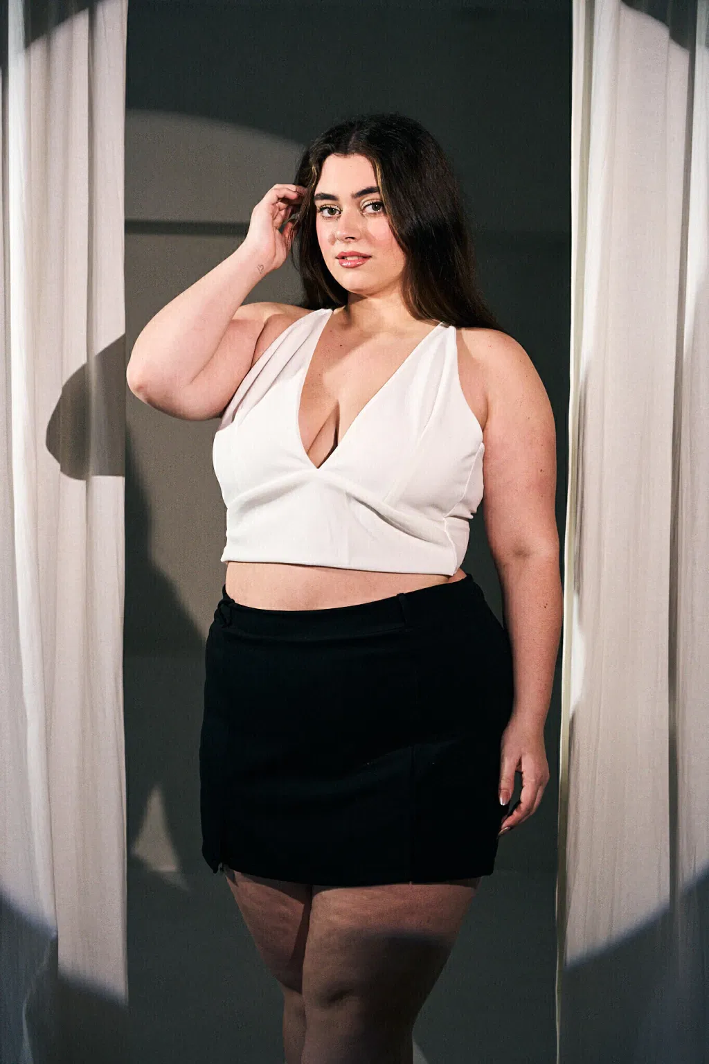 • Top de crep sin mangas con espalda descubierta y tiras para cruzar. El top tiene amplia capaciadad de busto.