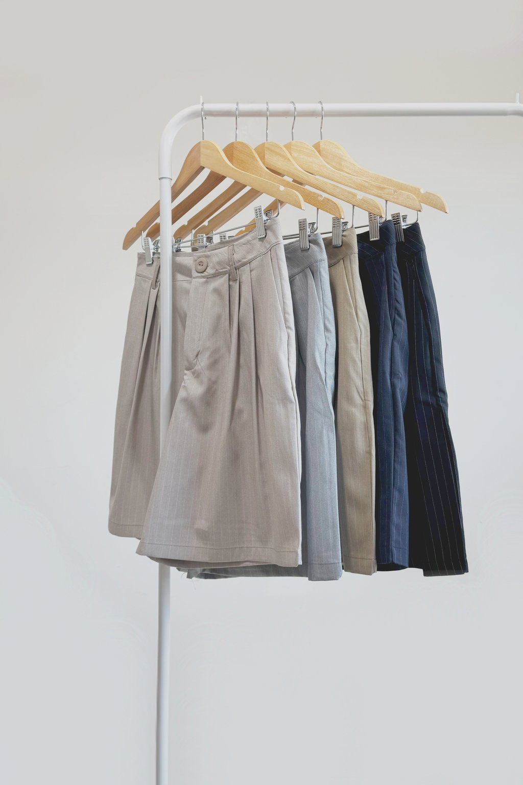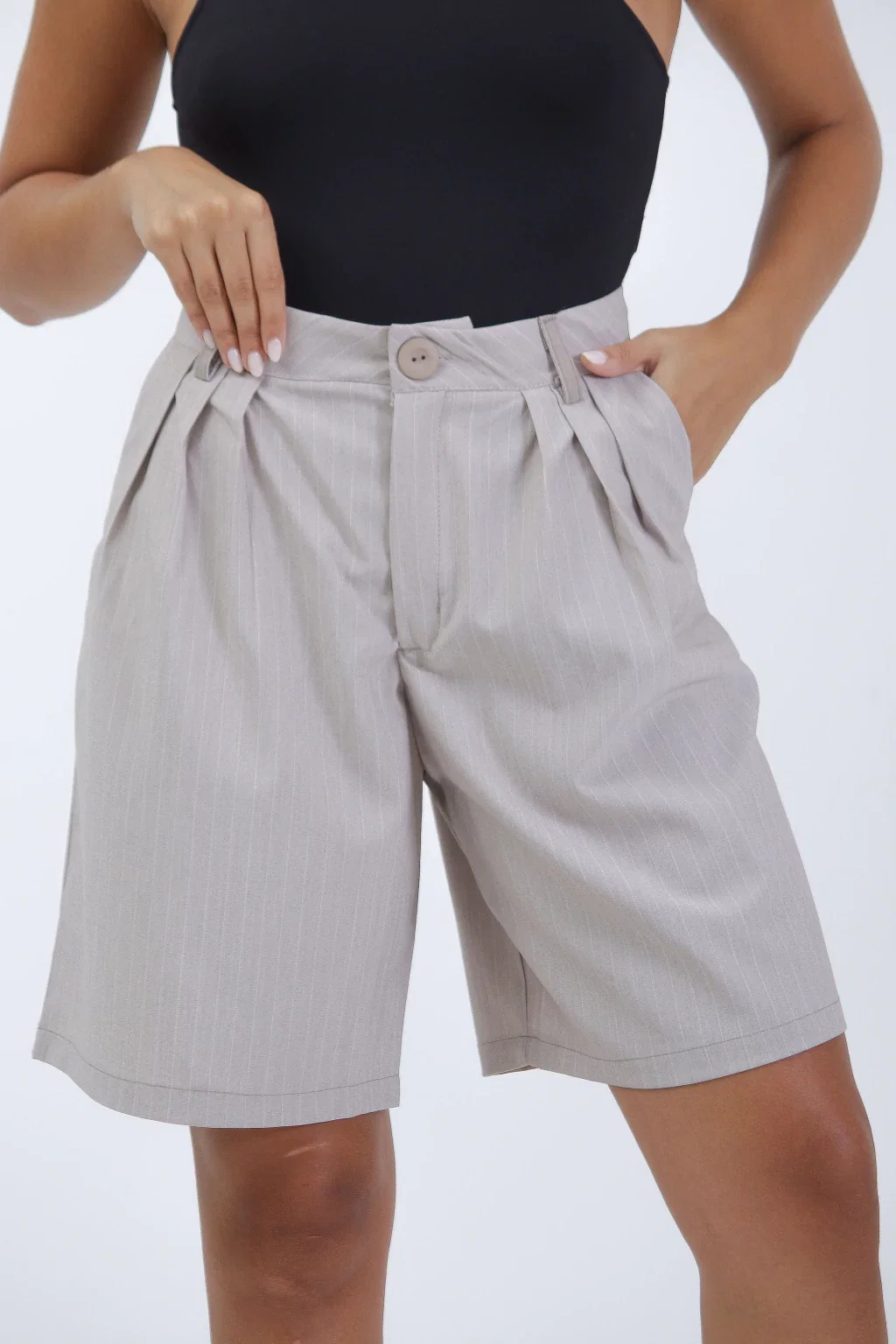 • Bermuda confeccionada en sastrero rayado, con pasacintos, bolsillos y botón a tono.
