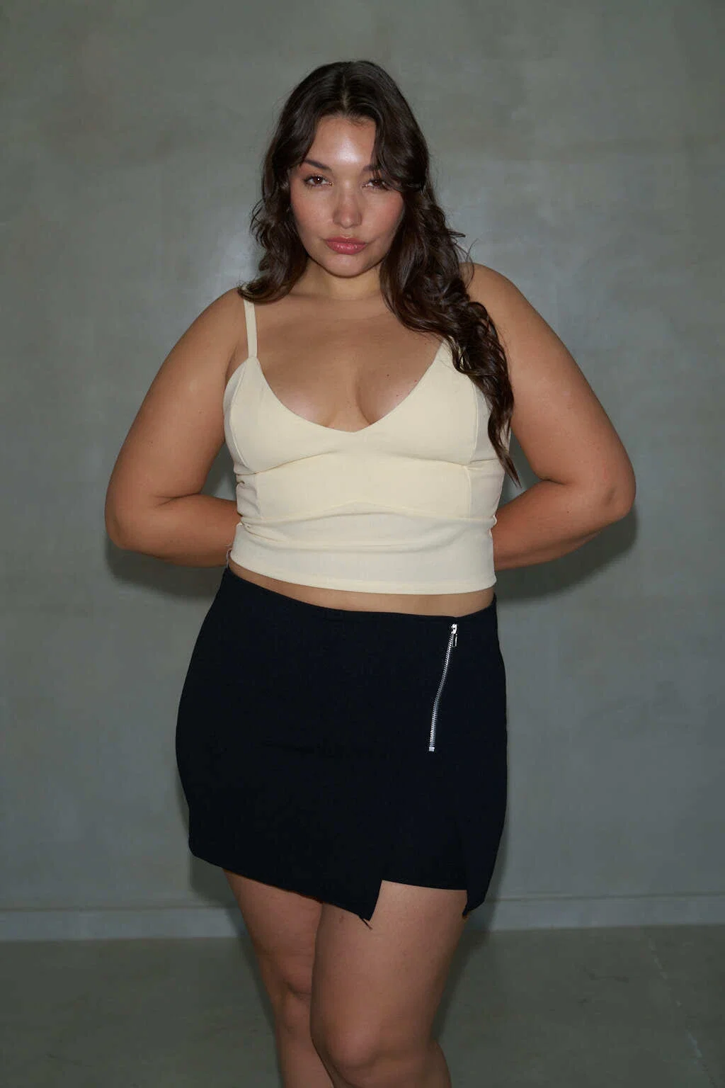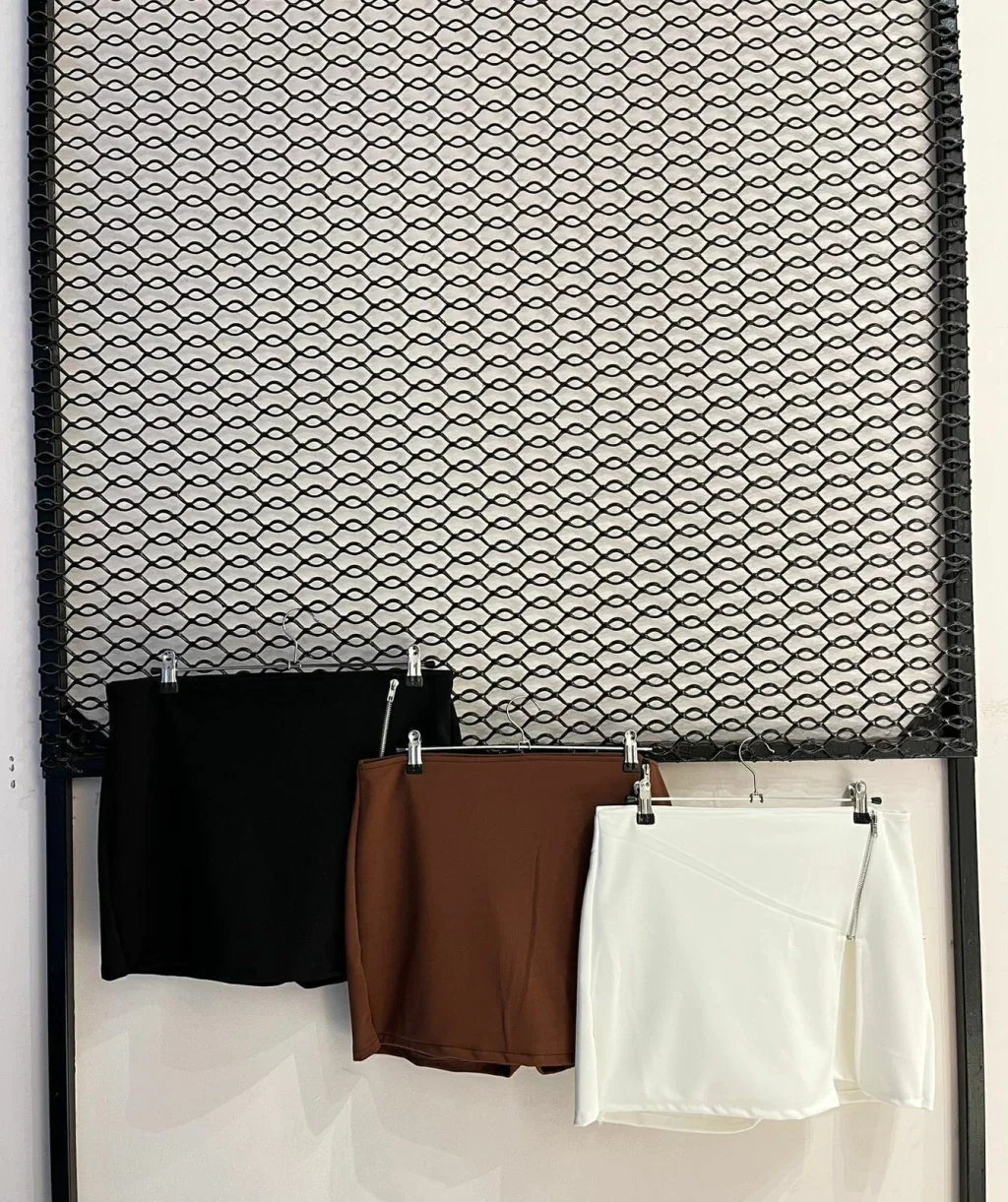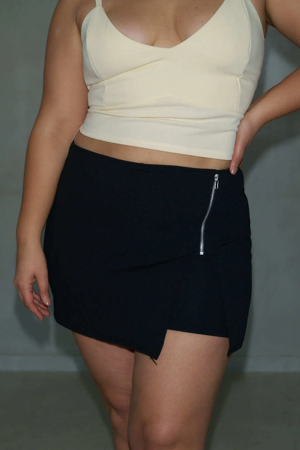 • Skort de scuba crep con pasacintos, elastico trasero y tajos delanteros.