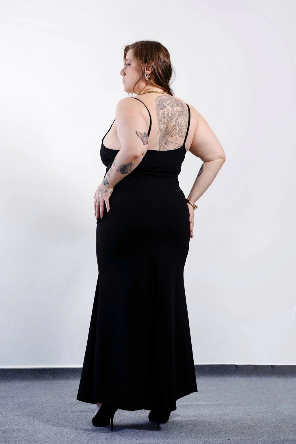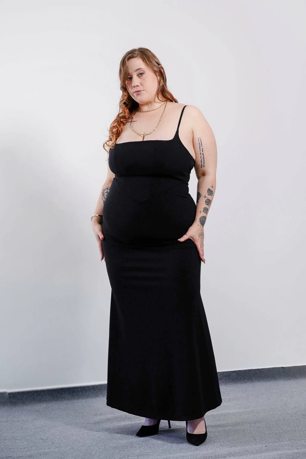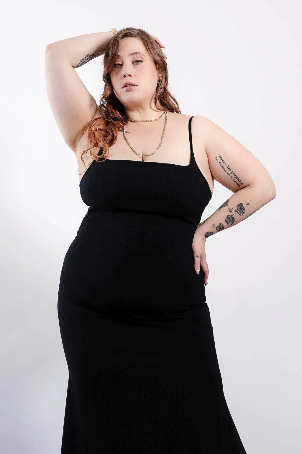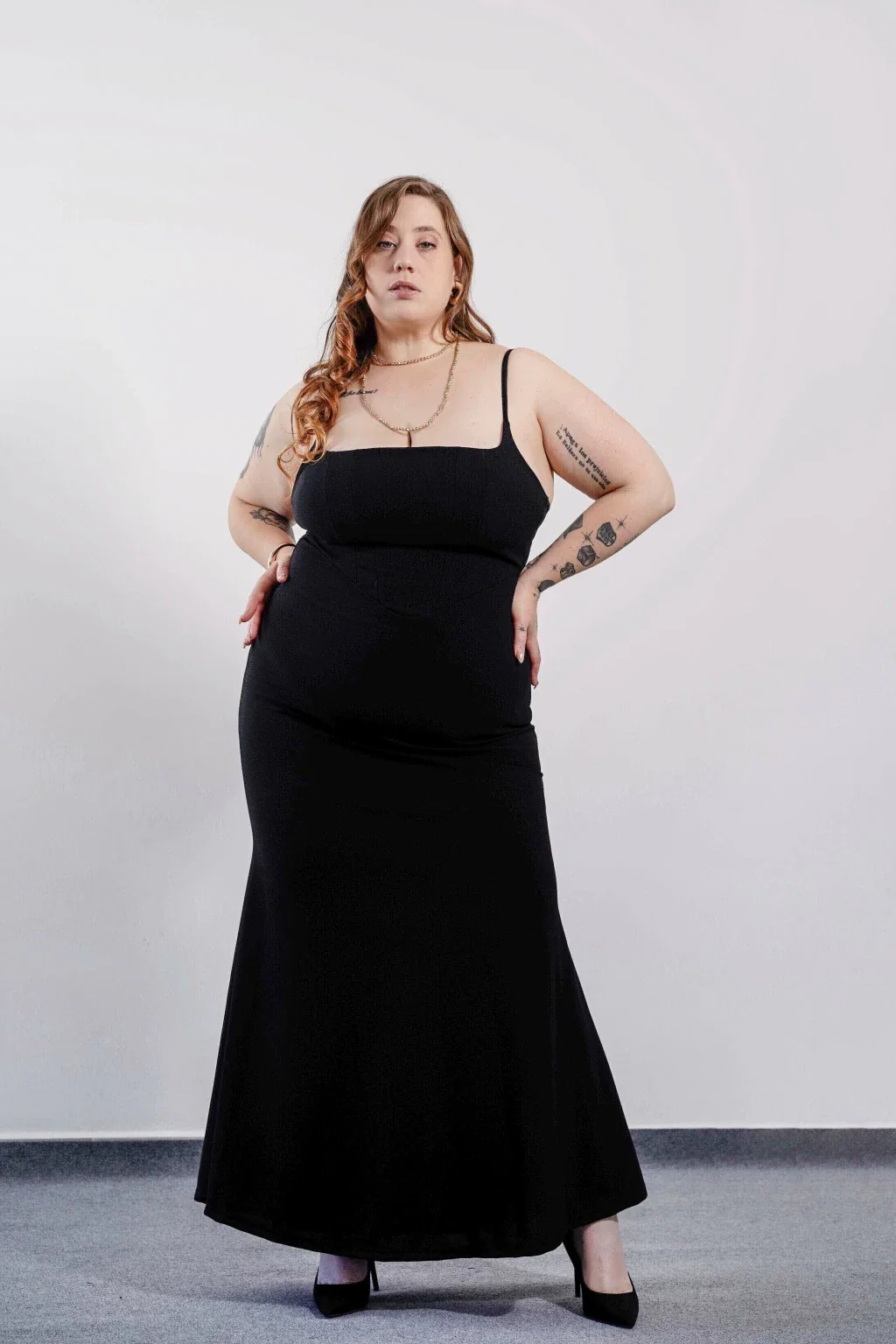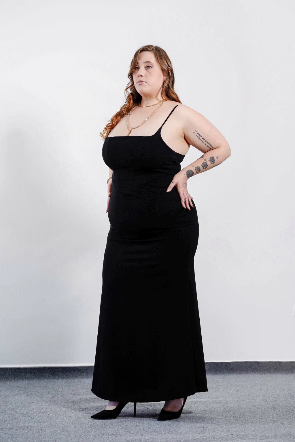 • Vestido largo corte sirena de scuba crepe. La prenda cede hasta 10cm mas por talle.