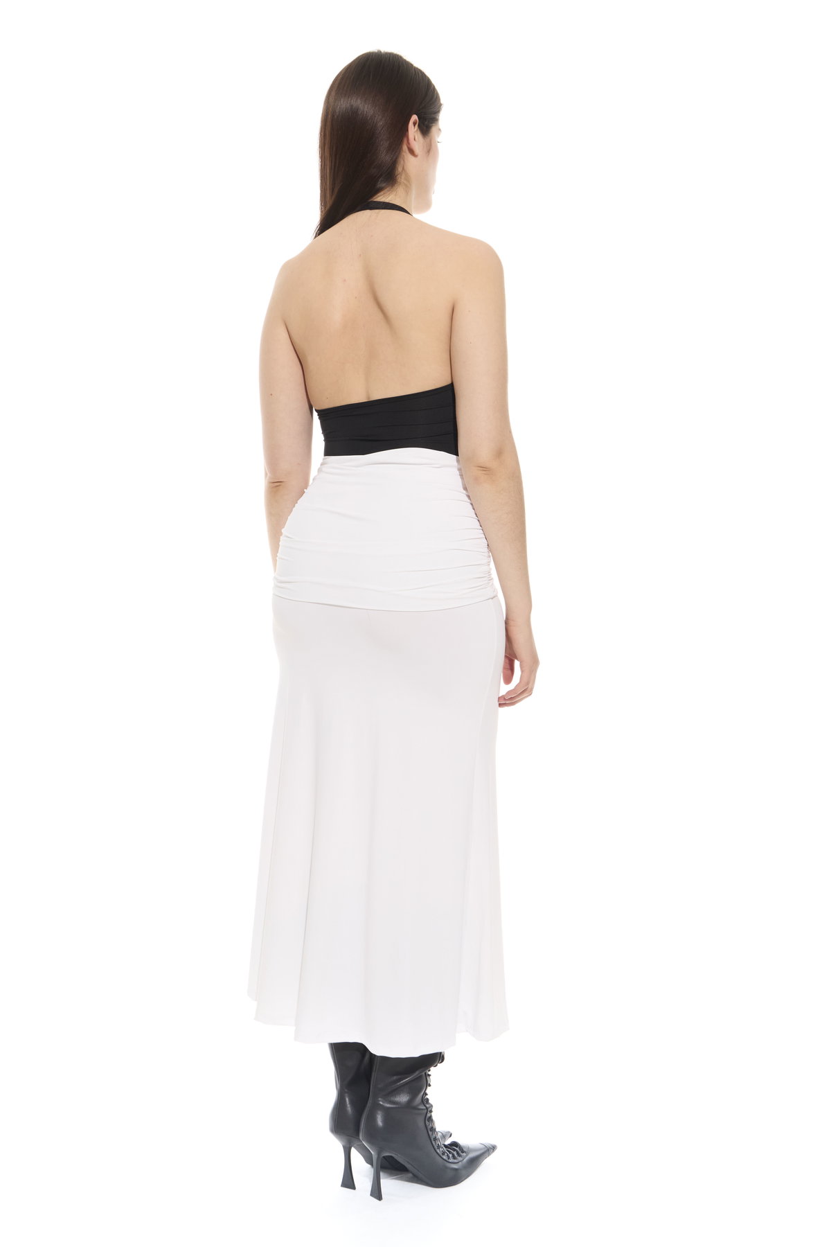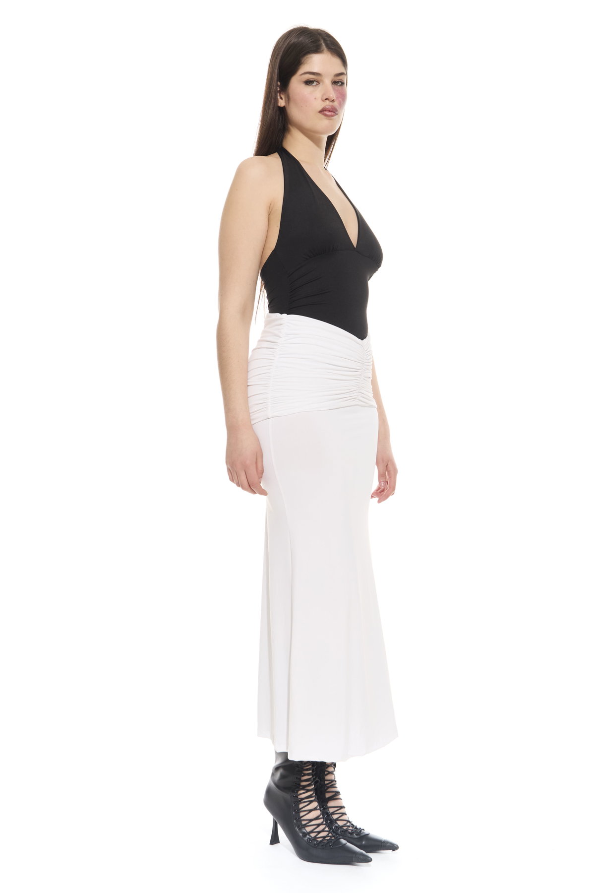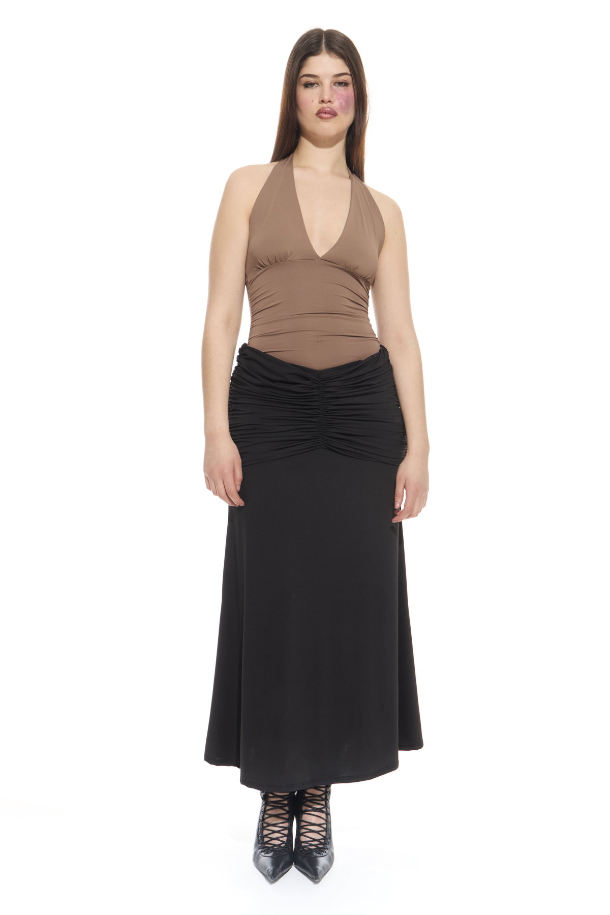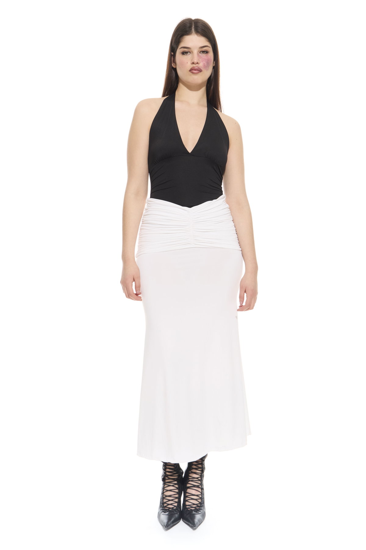 • Pollera larga con faja fruncida para usar tiro bajo a la cadera o tiro alto. Hecho en microfibra liviana.