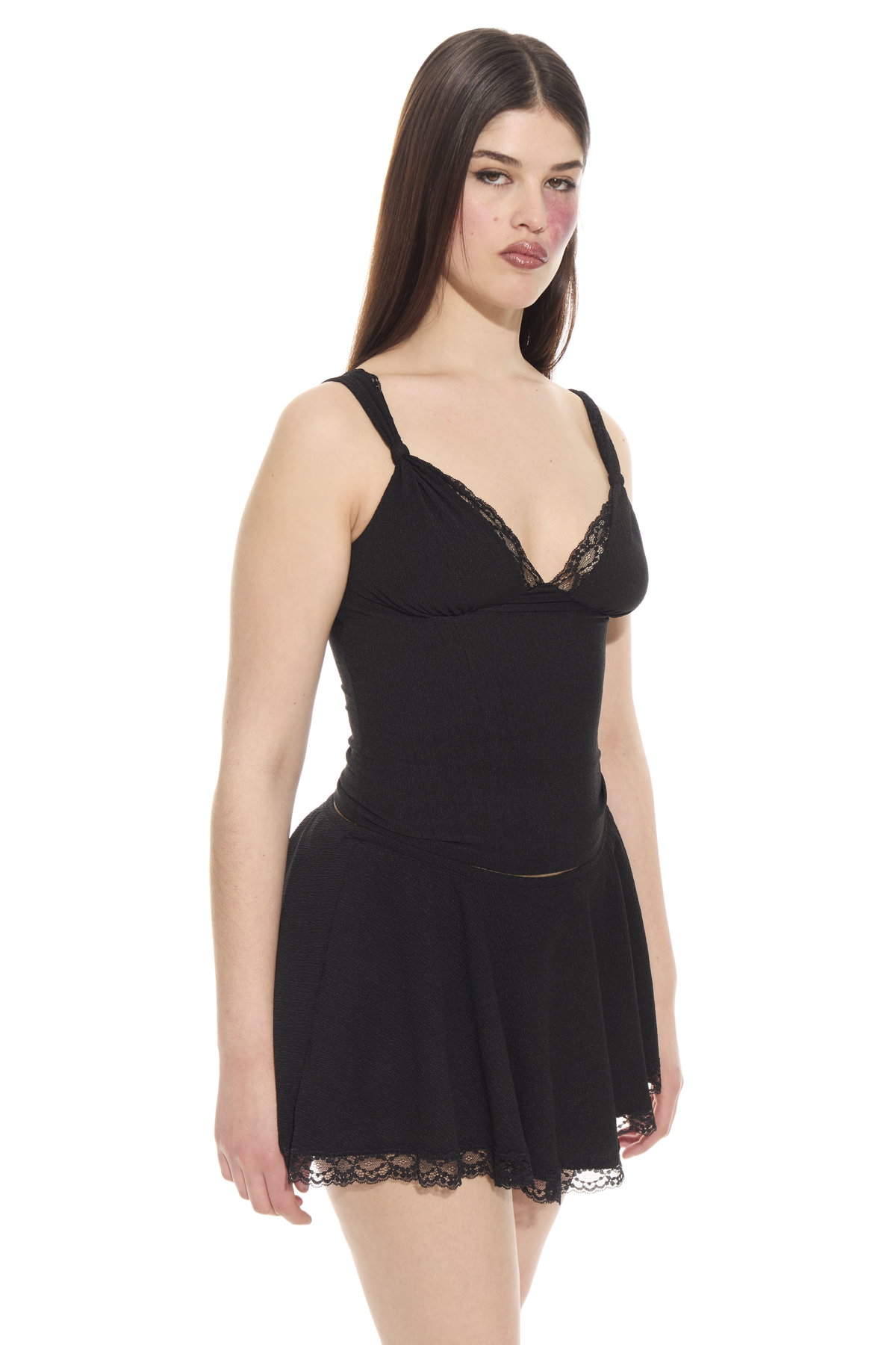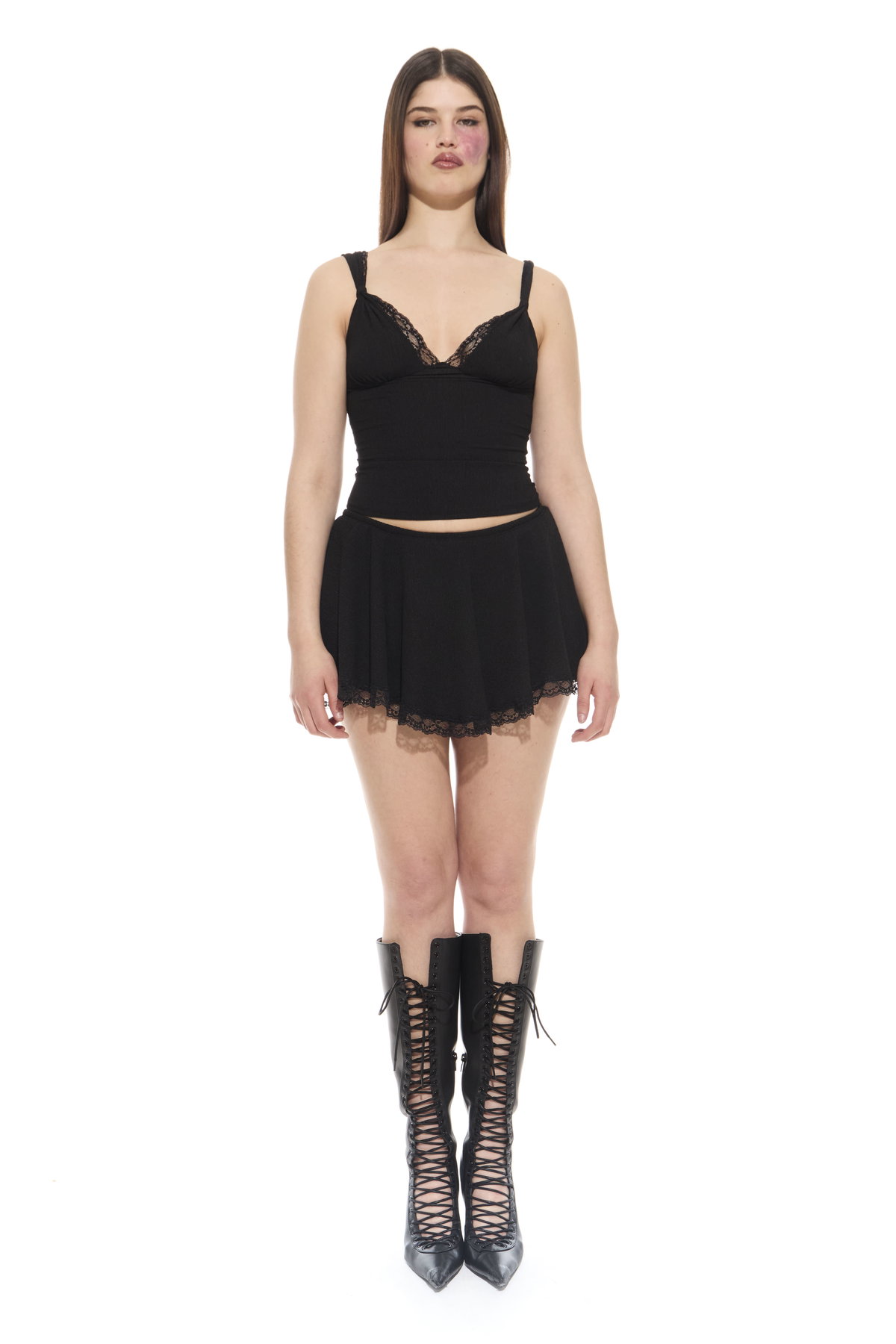 • Short pollera tiro medio con detalle de puntilla en el contorno.