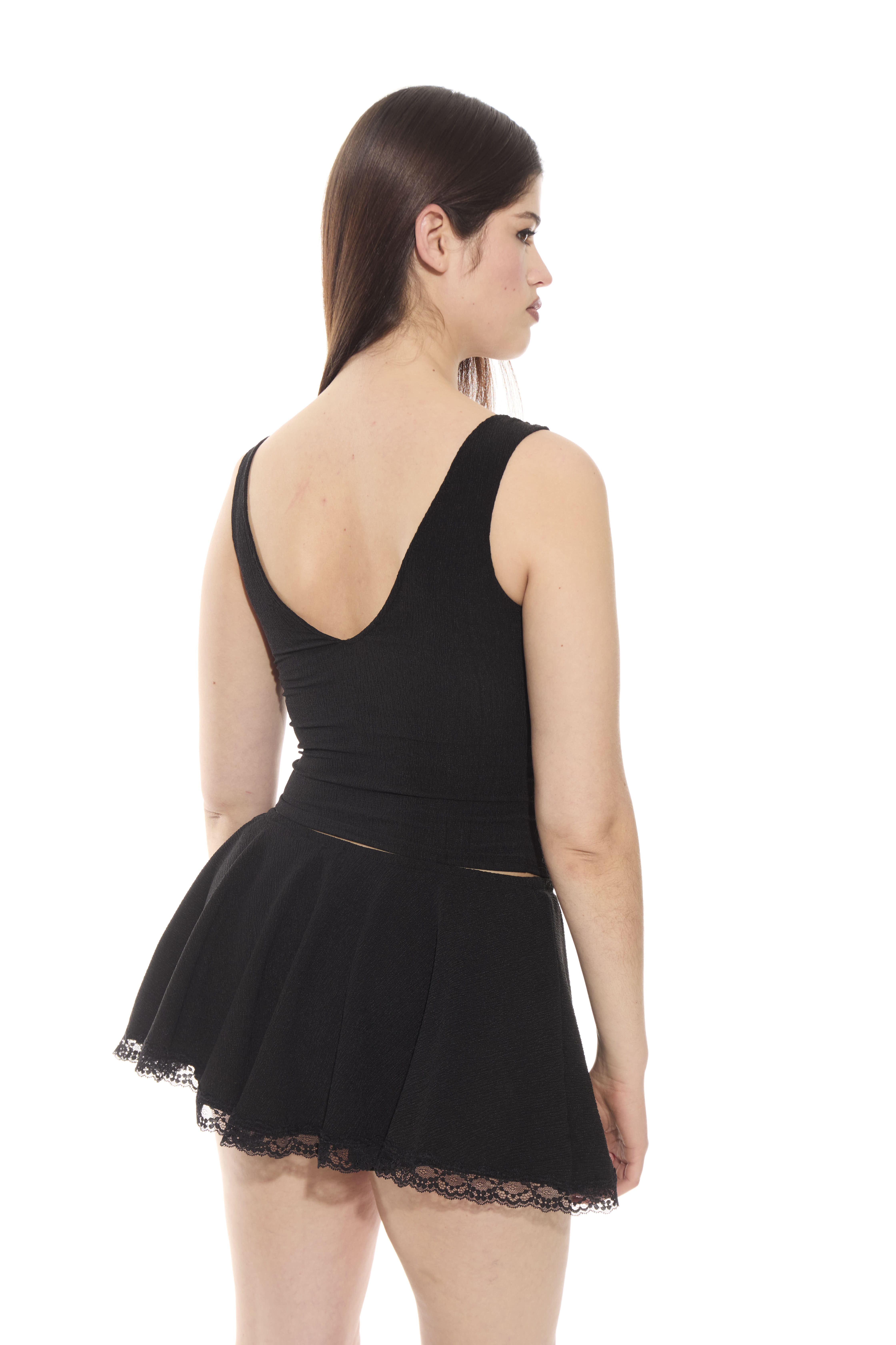 • Top con tazas y pinzas, con detalle de puntilla en breteles y escote. Breteles regulables para ajustar al busto.