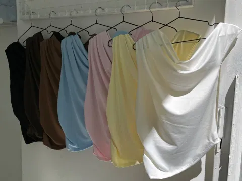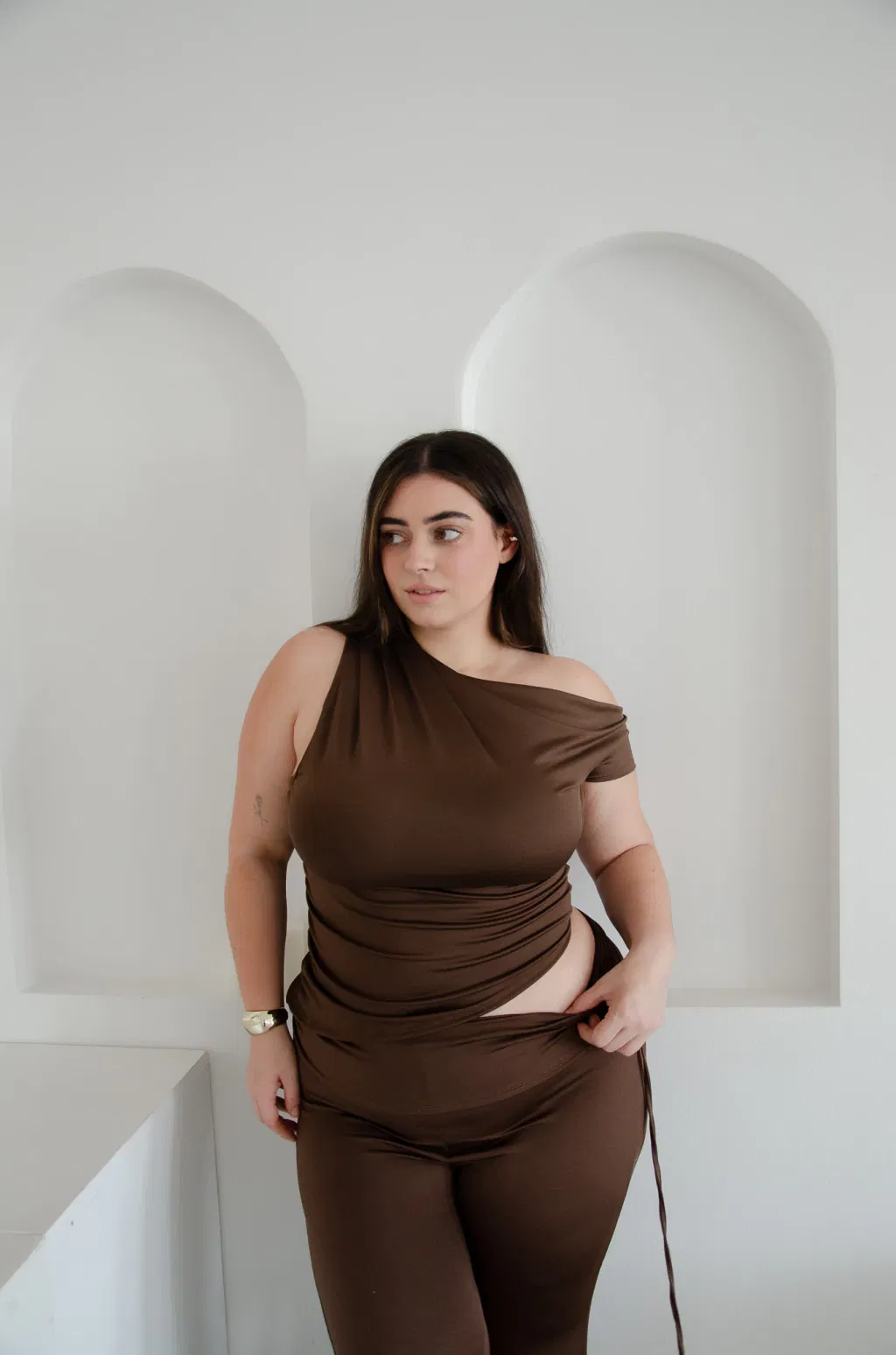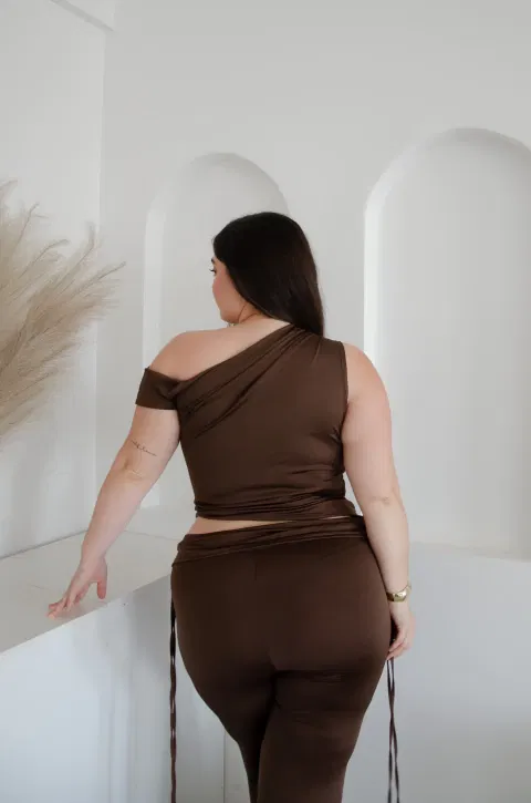 • Top de microfibra con hombro caído y tablitas de deco. La modelo usa XL.