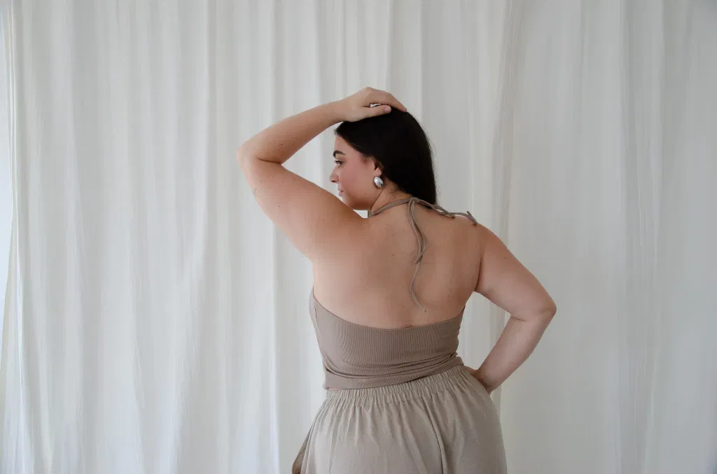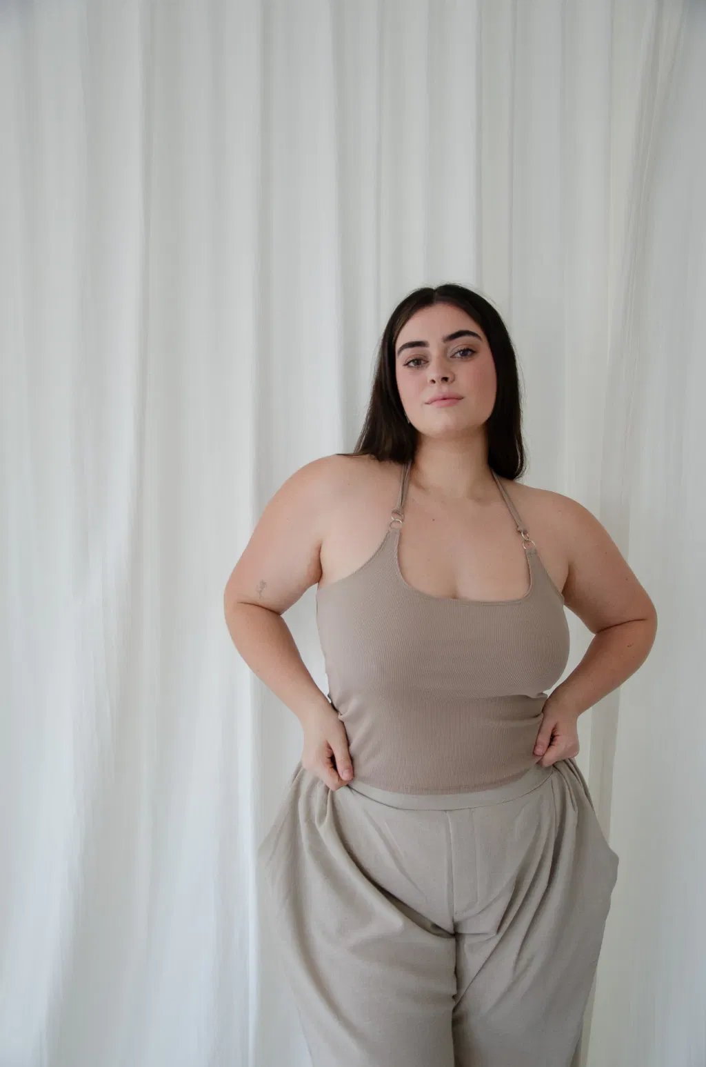 • Top de morley soft halter con detalle de argollas. La modelo usa XL.
