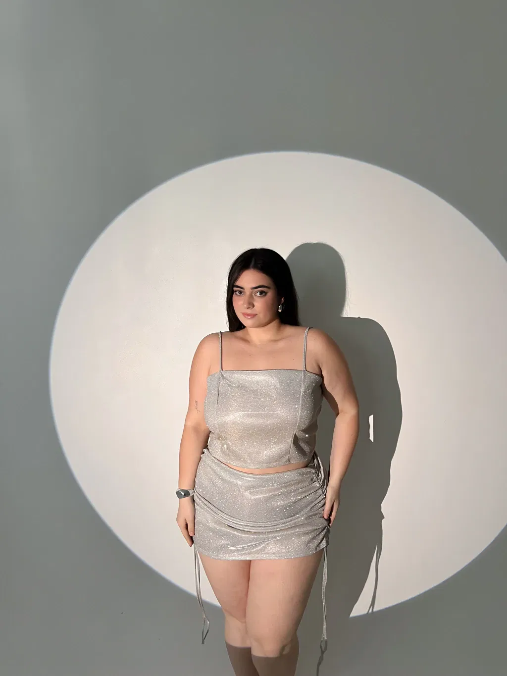 • Mini glitter con frunces a los costados. La modelo usa un 44.
