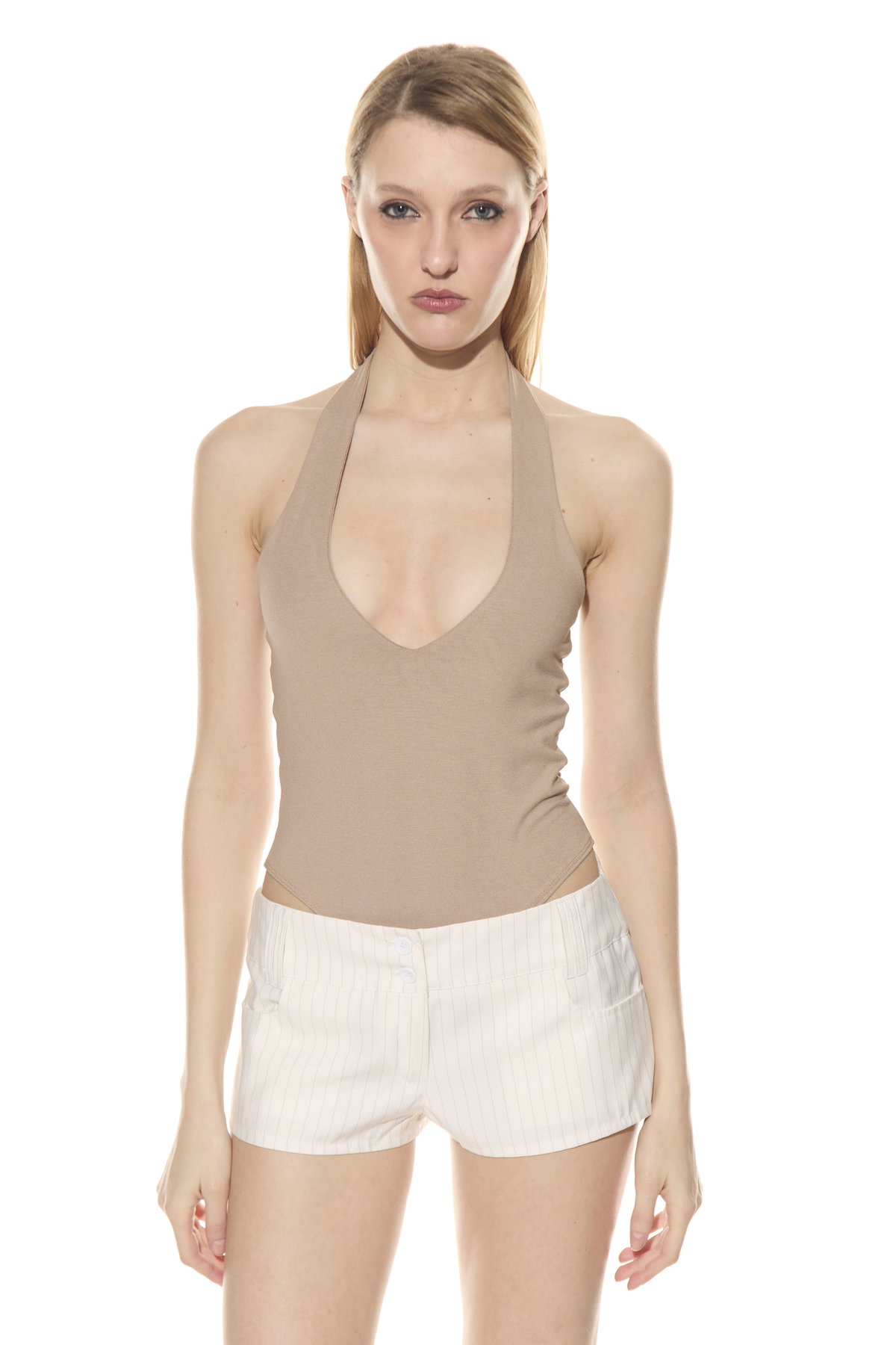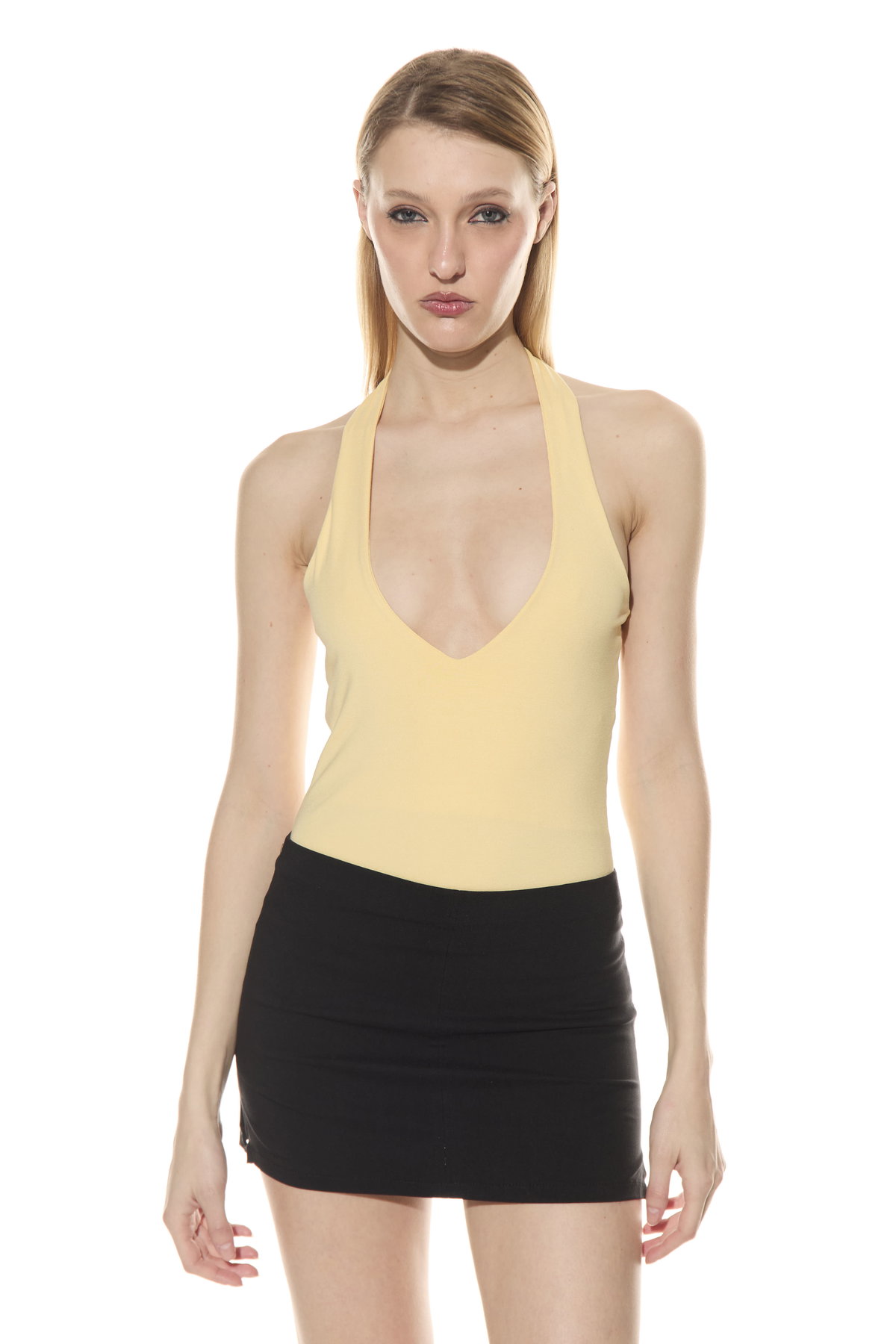 • Body cuello halter escote V con broches para abrir y cerrar. Hecho en interlock de viscosa.