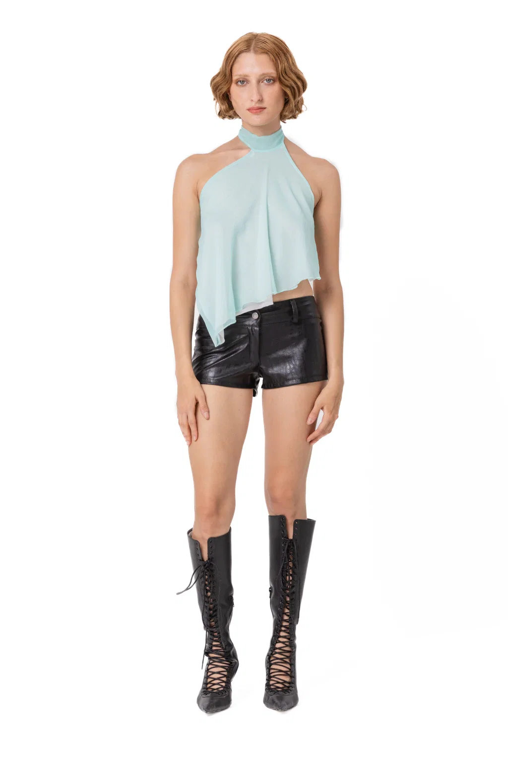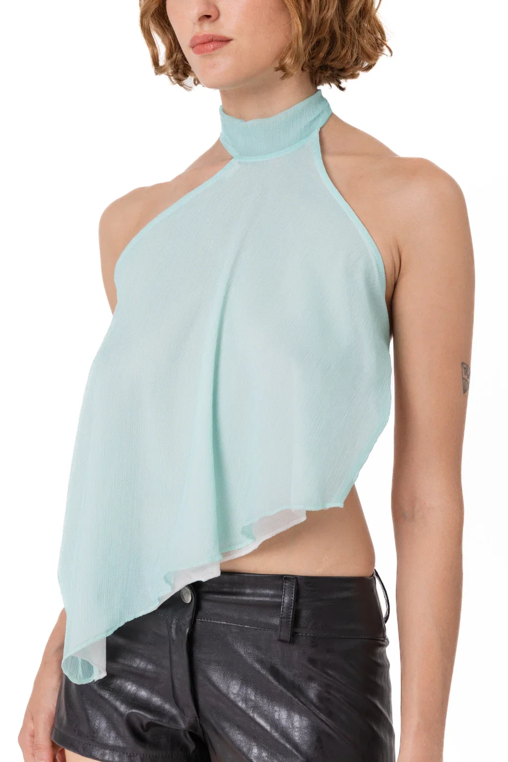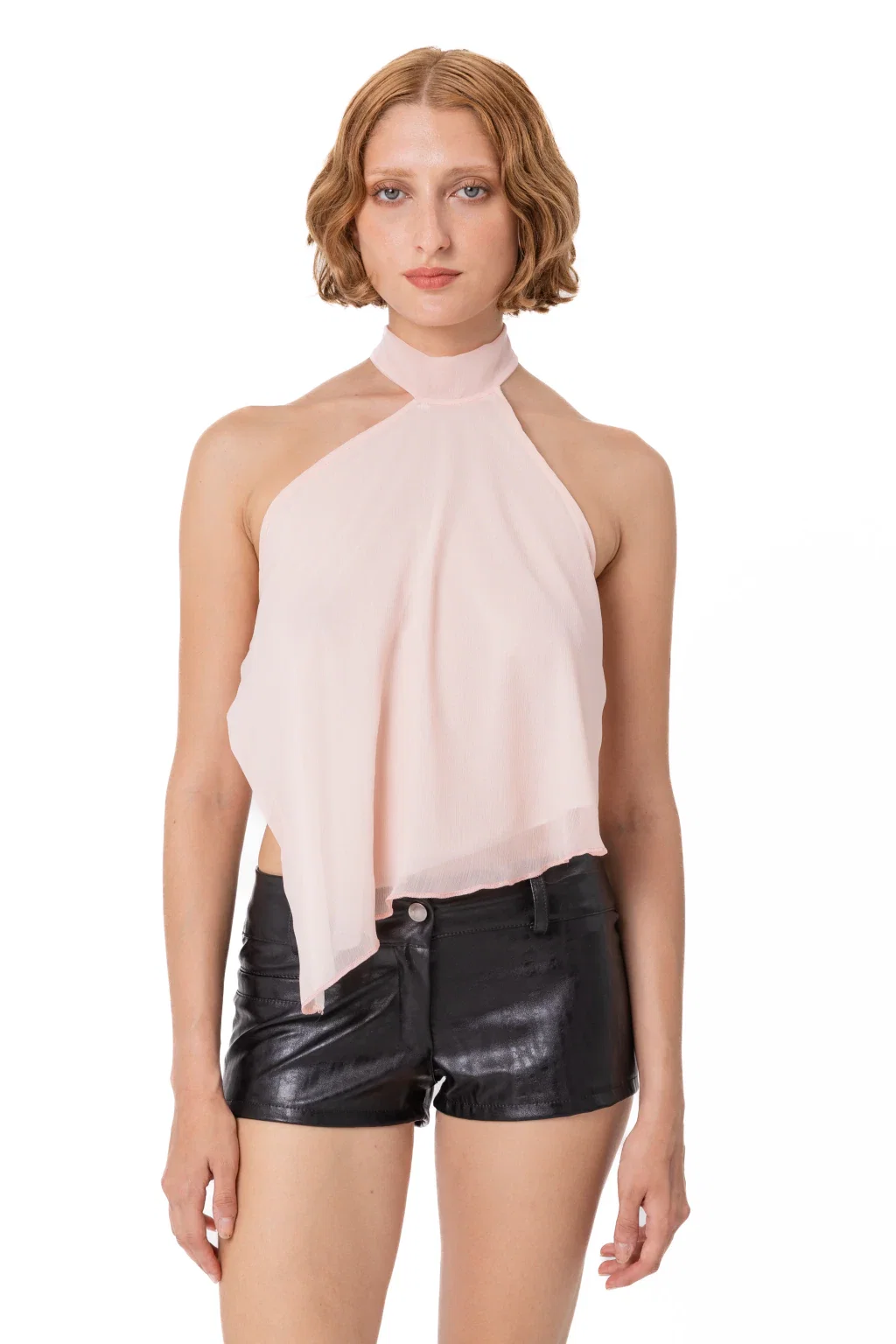 • Top con cuello para atar hecho en gasa crep tramado con forreria. Espalda descubierta con tira regulable.