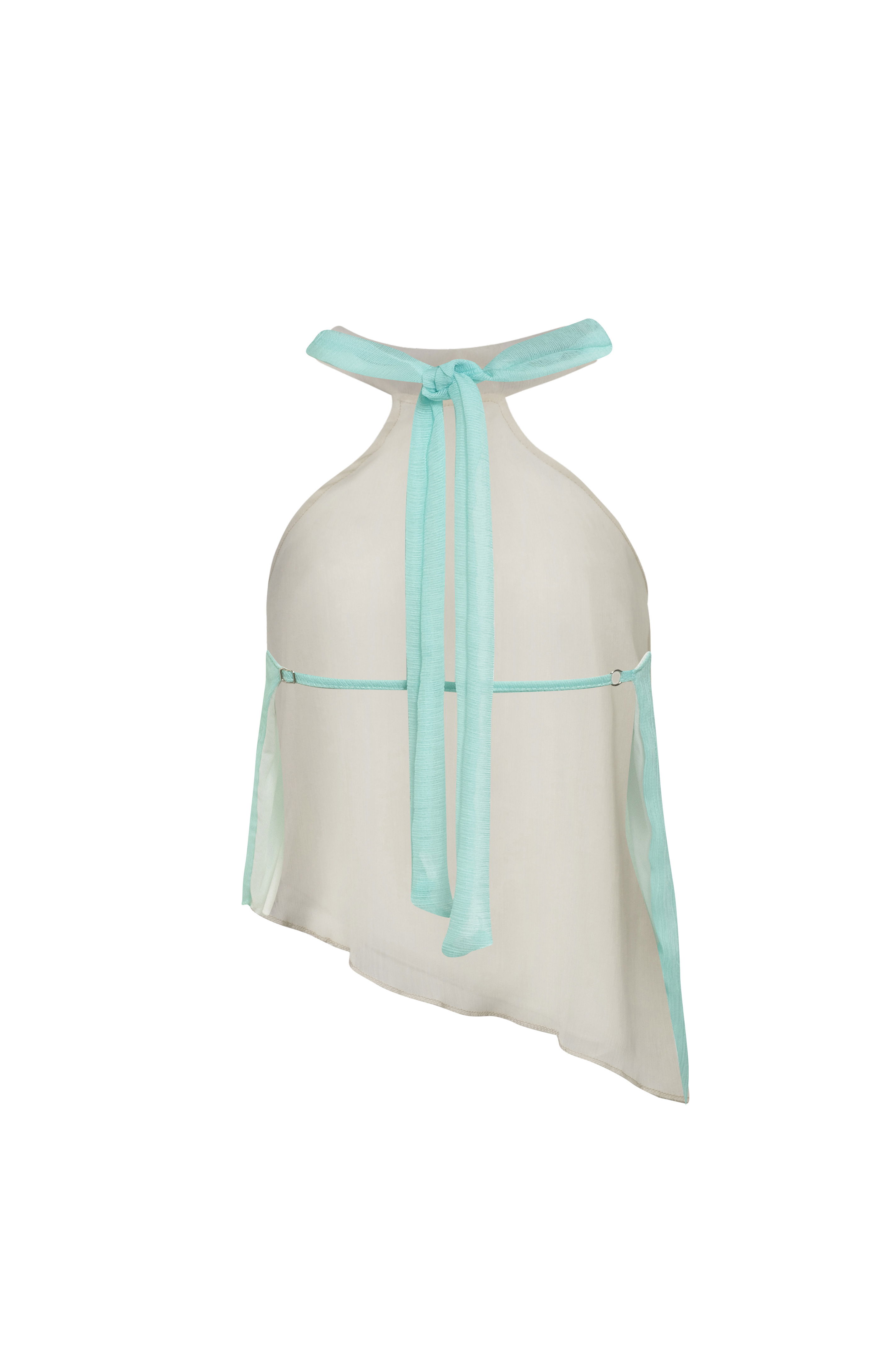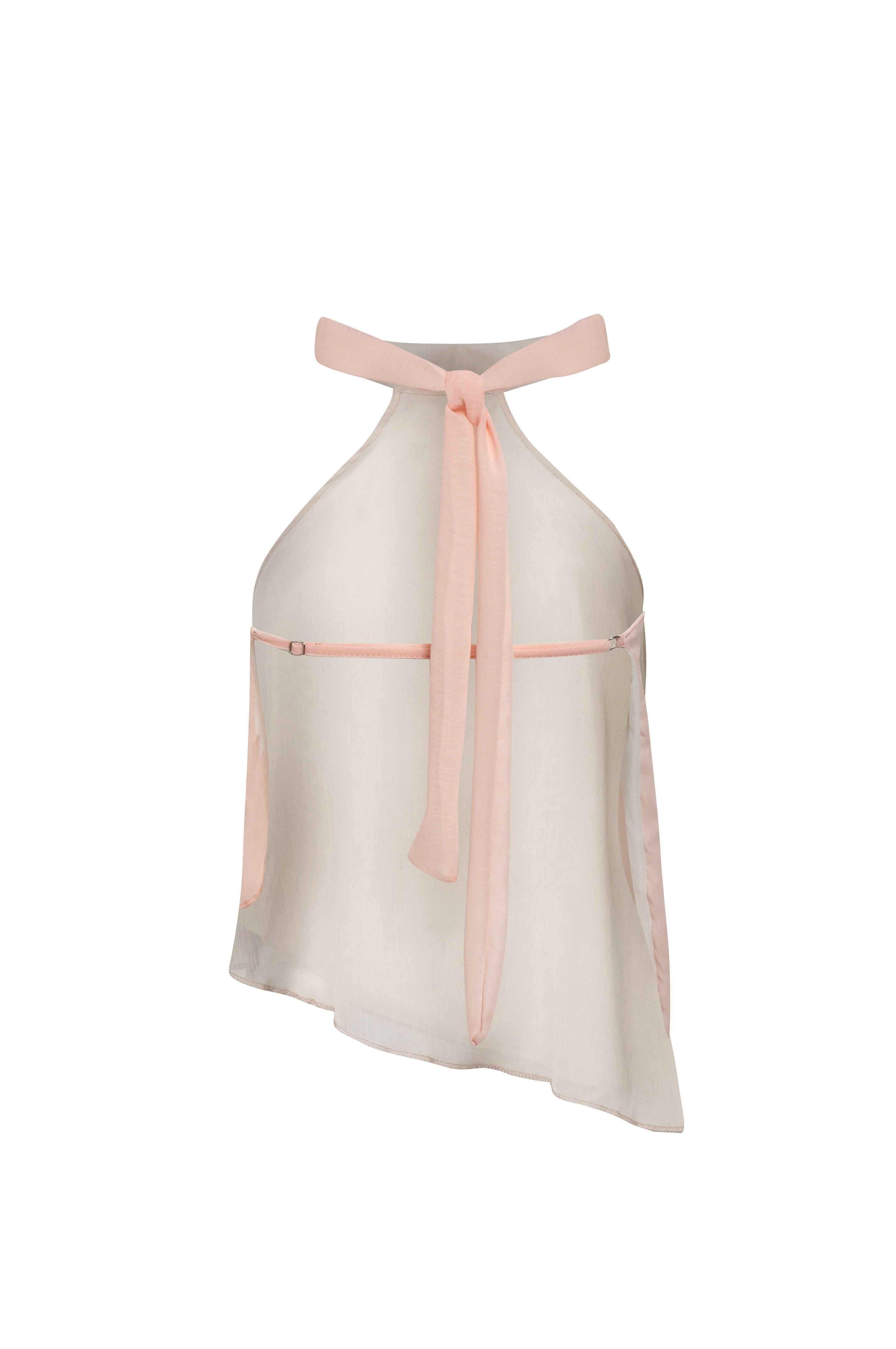 • Top con cuello para atar hecho en gasa crep tramado con forreria. Espalda descubierta con tira regulable.