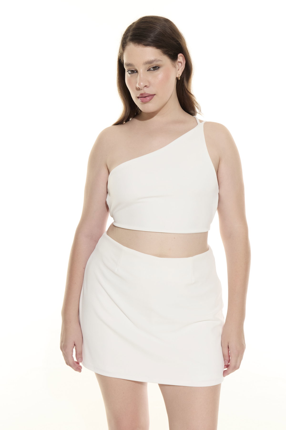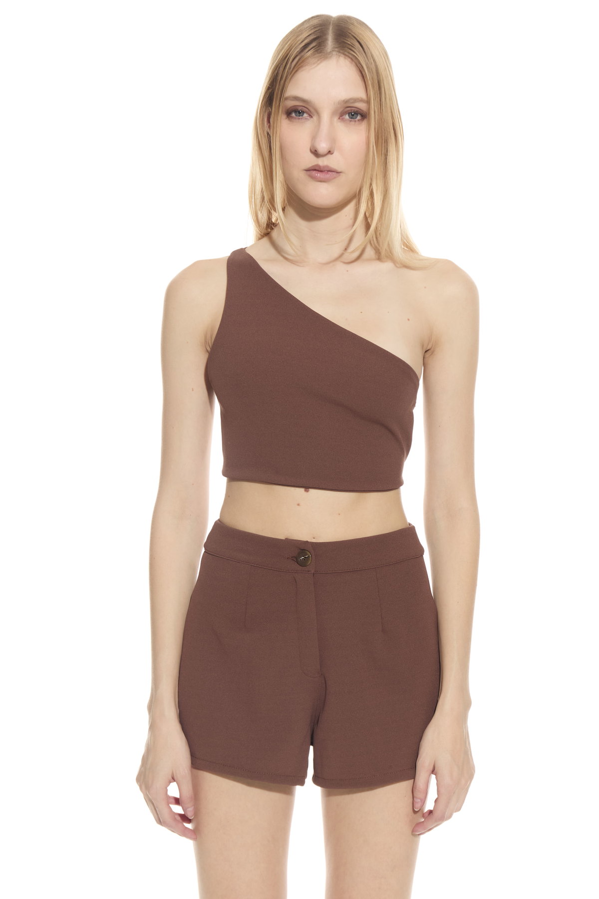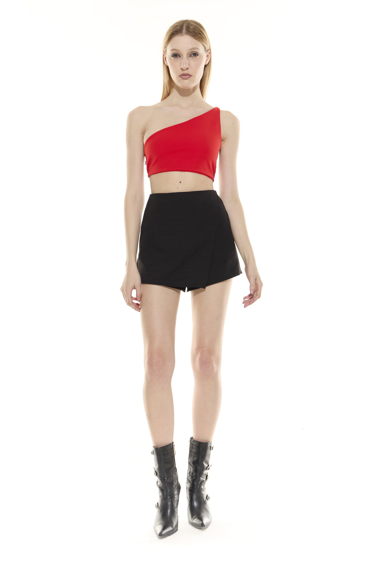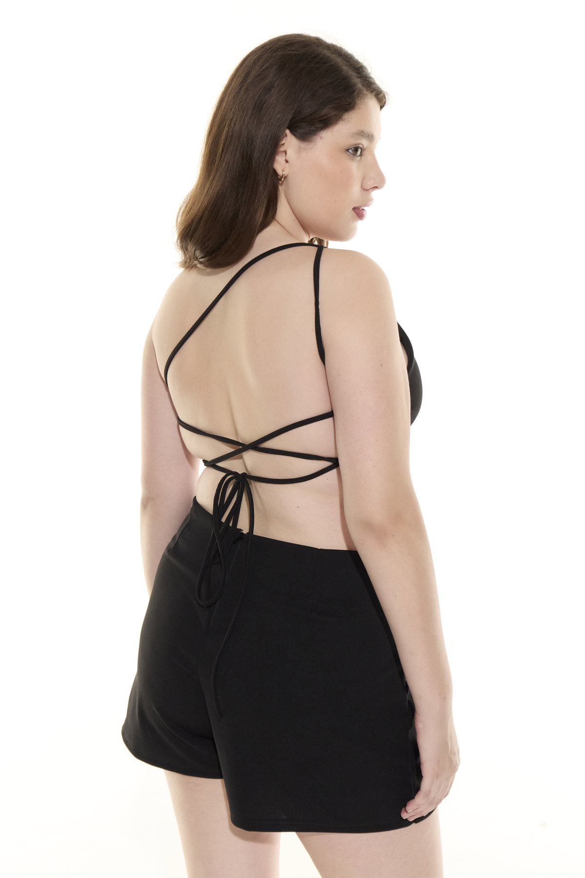• Top de crep de un hombro, con espalda descubierta y tiras para atar.