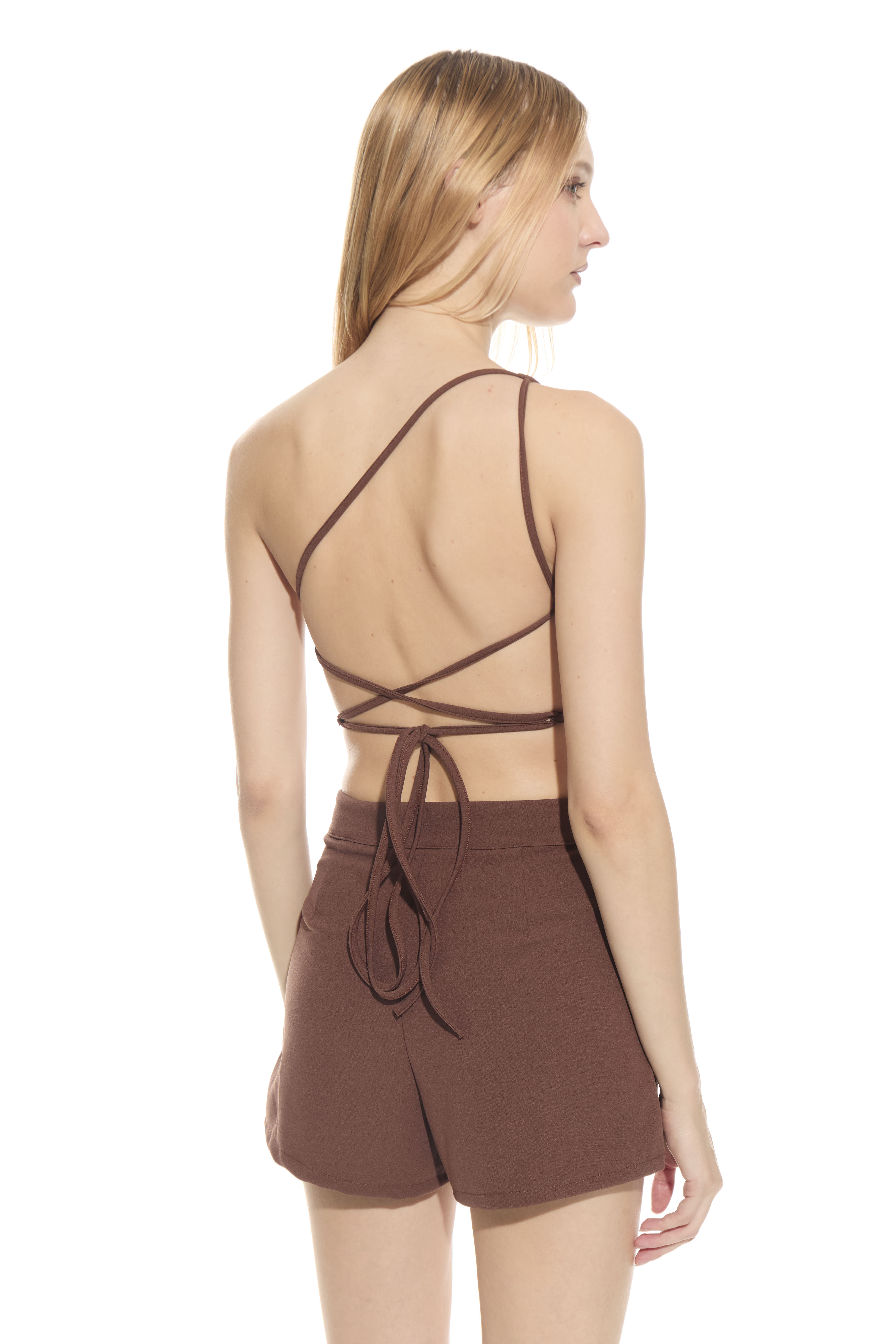 • Top de crep de un hombro, con espalda descubierta y tiras para atar.