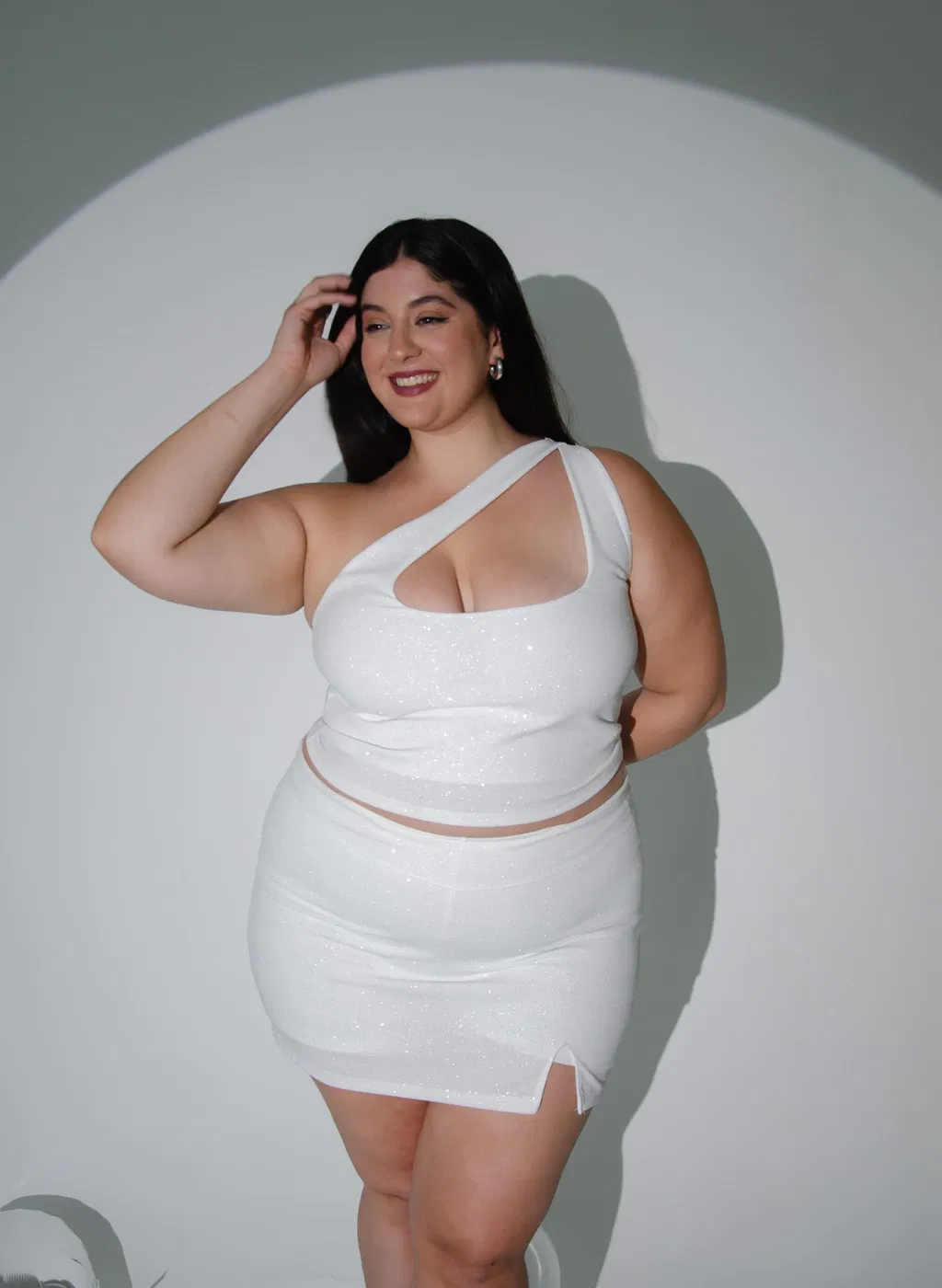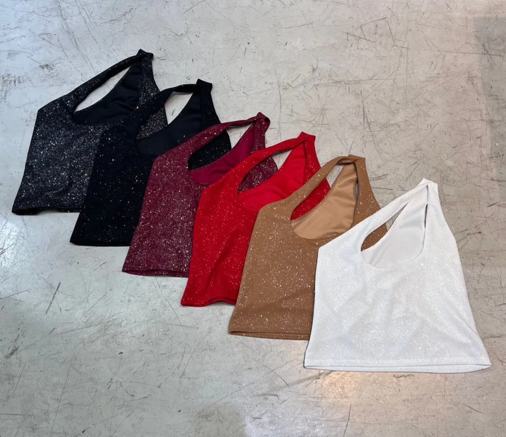 • Top de una manga confeccionado en crep glitter y abertura decorativa.
