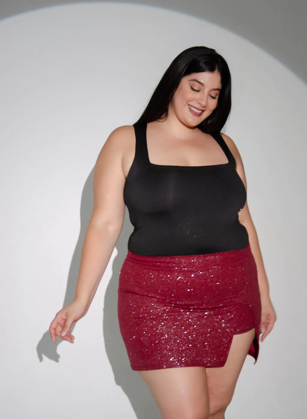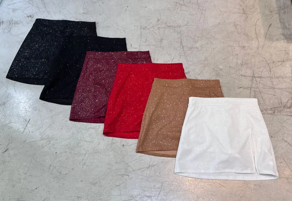 • Skort de crep con glitter. Tajo delantero y falda trasera.