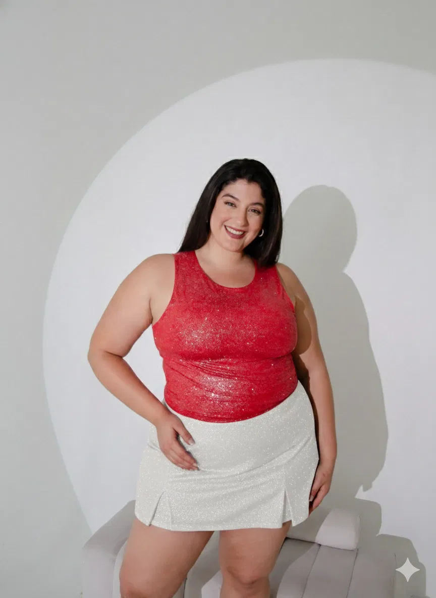 • Body de microfibra con escote cuadrado y breteles anchos. Tiene ganchos en el tiro. La modelo viste el XXL. La tela tiene glitter pegados