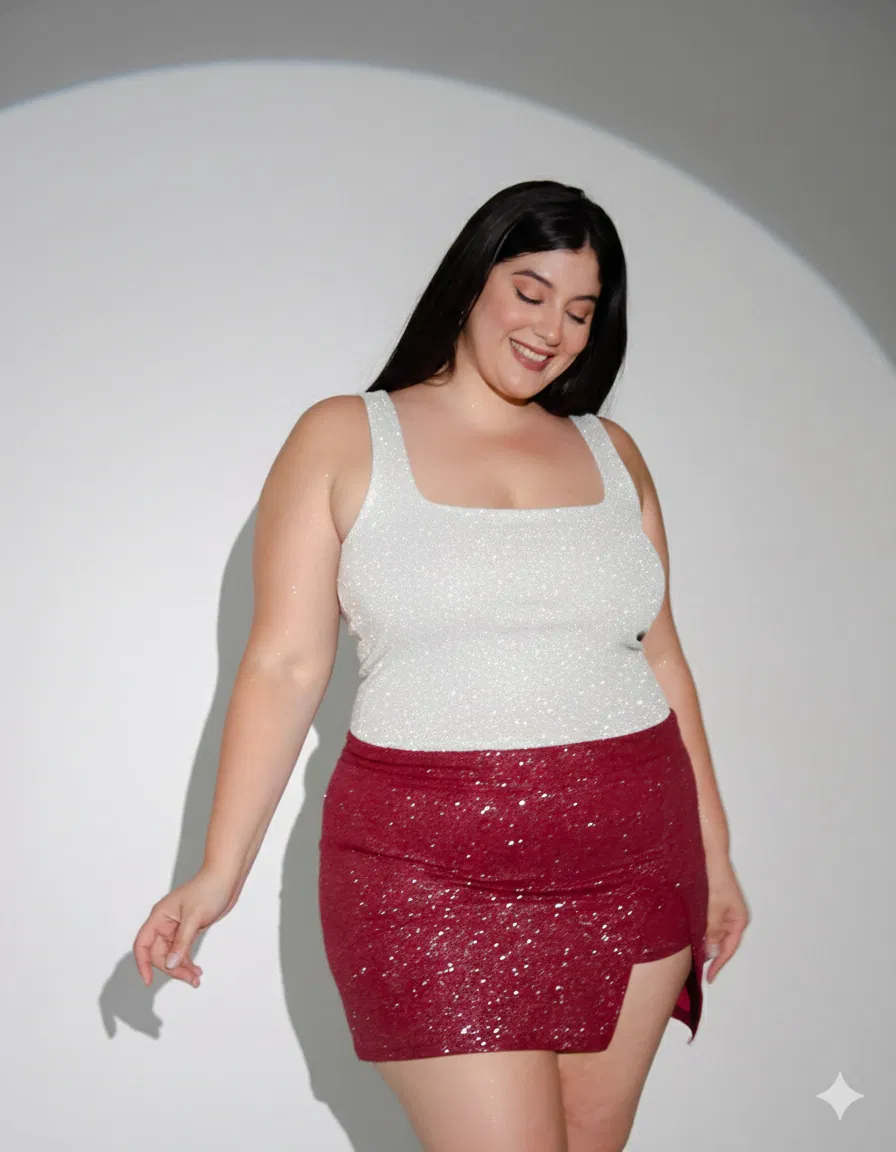 • Body de microfibra con escote cuadrado y breteles anchos. Tiene ganchos en el tiro. La modelo viste el XXL. La tela tiene glitter pegados