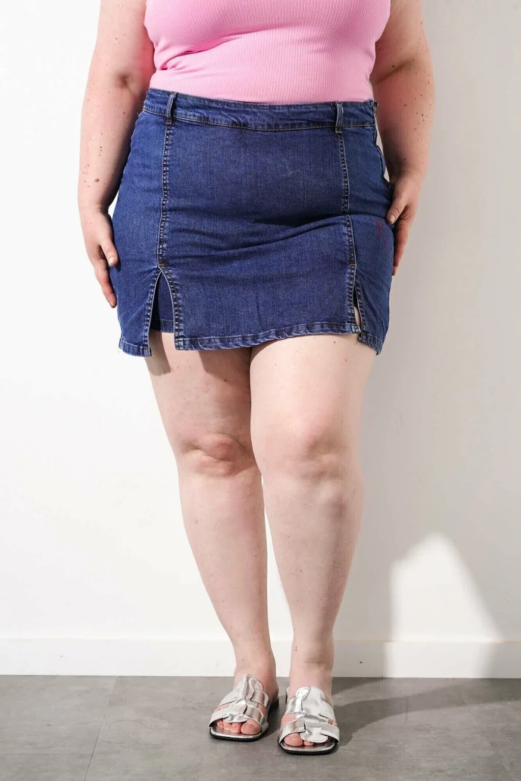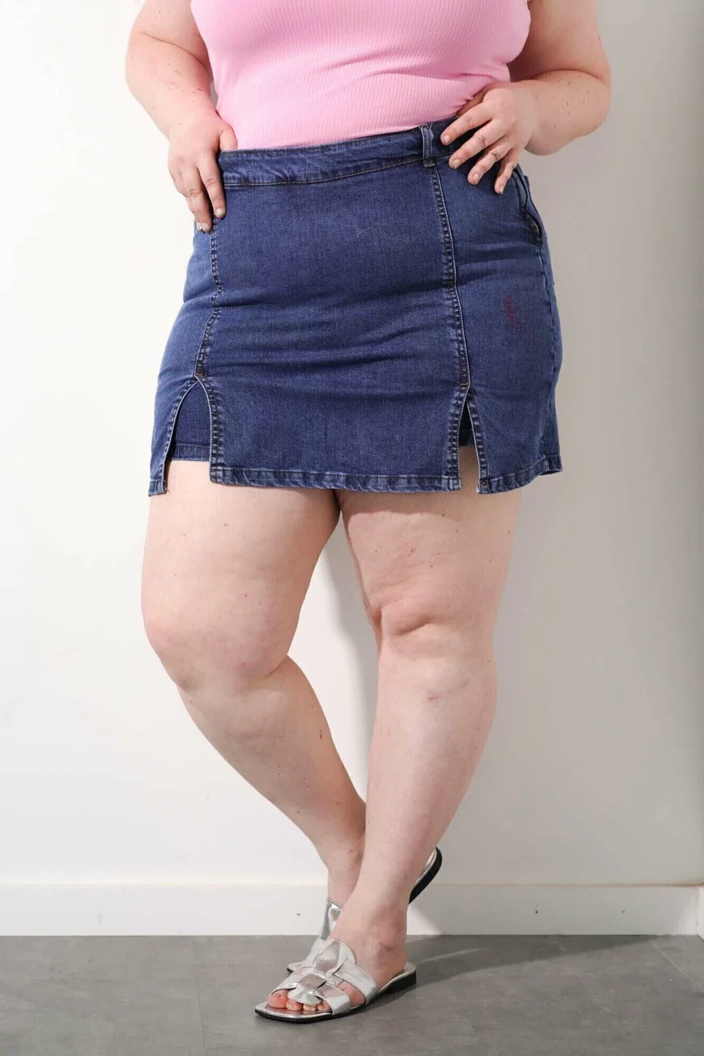 • Mini de jean elastizada con short interno y doble tajo, la prenda cede hasta 10cm mas por talle.
