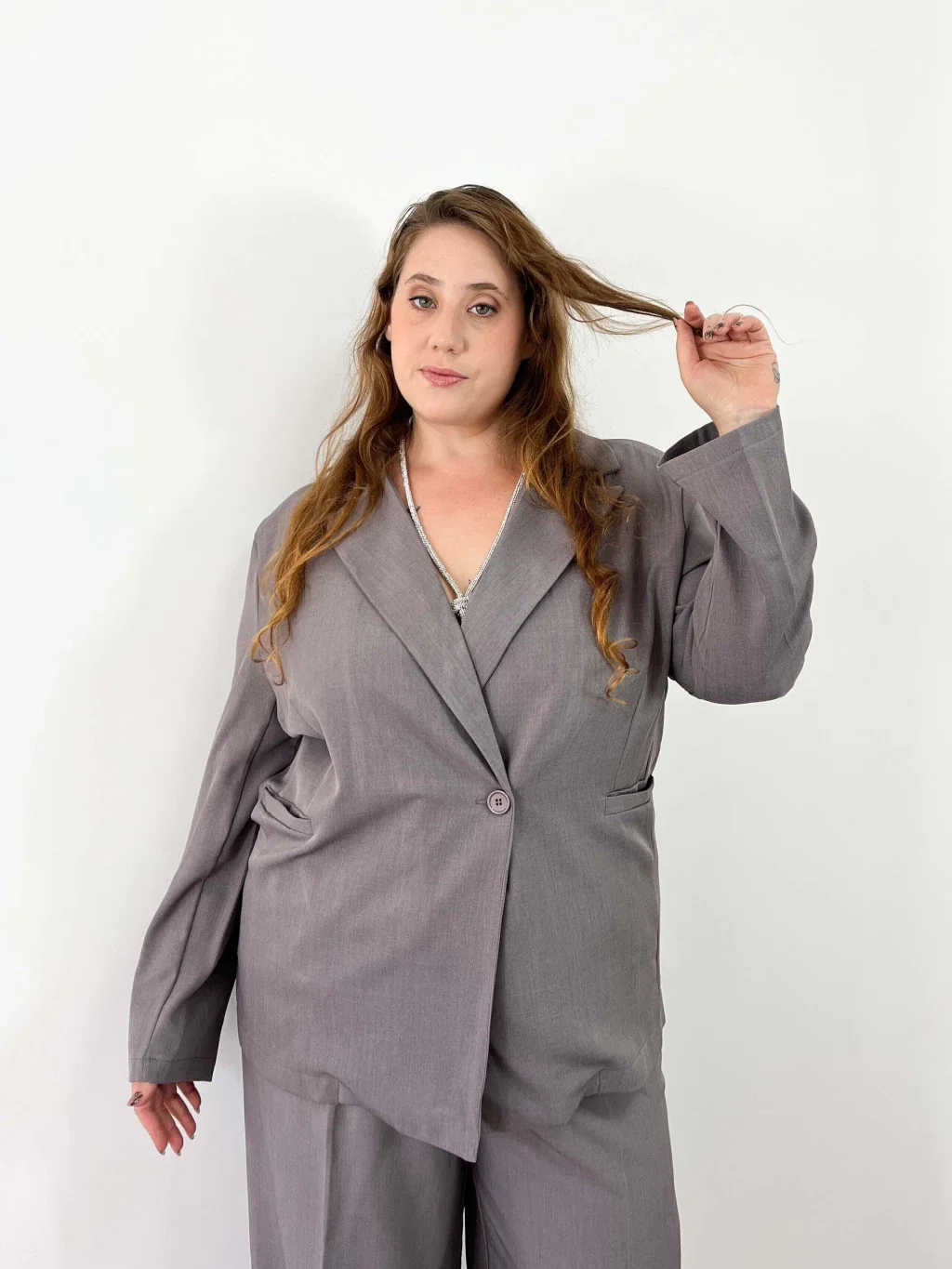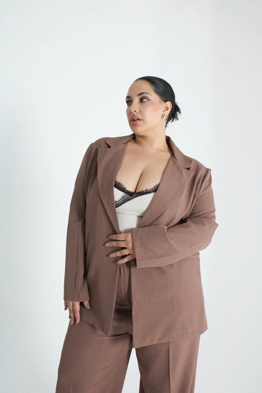 • Blazer sastrero, modelo cruzado con tejido jaspeado y hombreras.