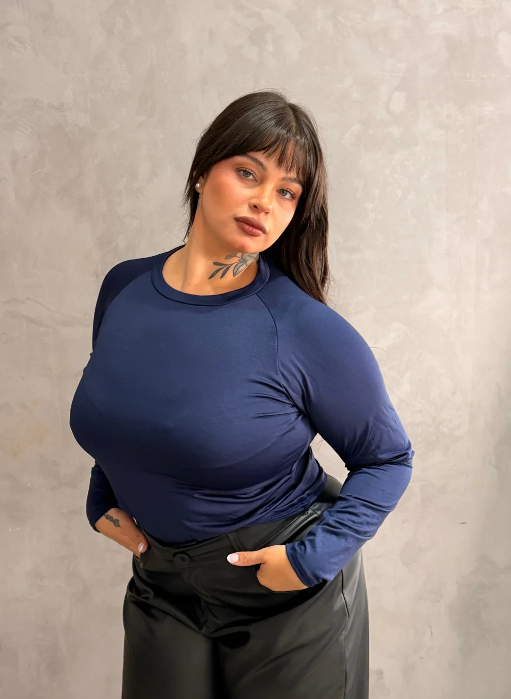 • Top manga larga con recorte en los hombros. La modelo viste el XL.