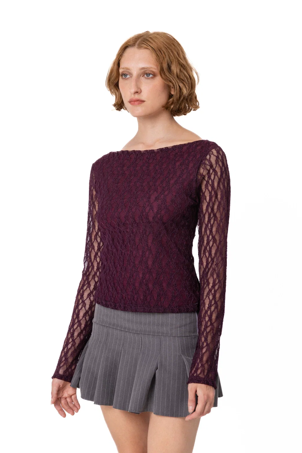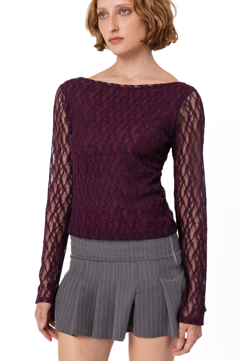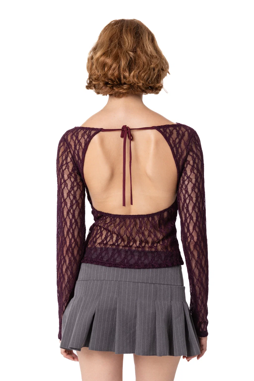 • Top manga larga de encaje de espalda baja con tiras para atar. Forreria en delantero. Mangas y espalda con transparencia.