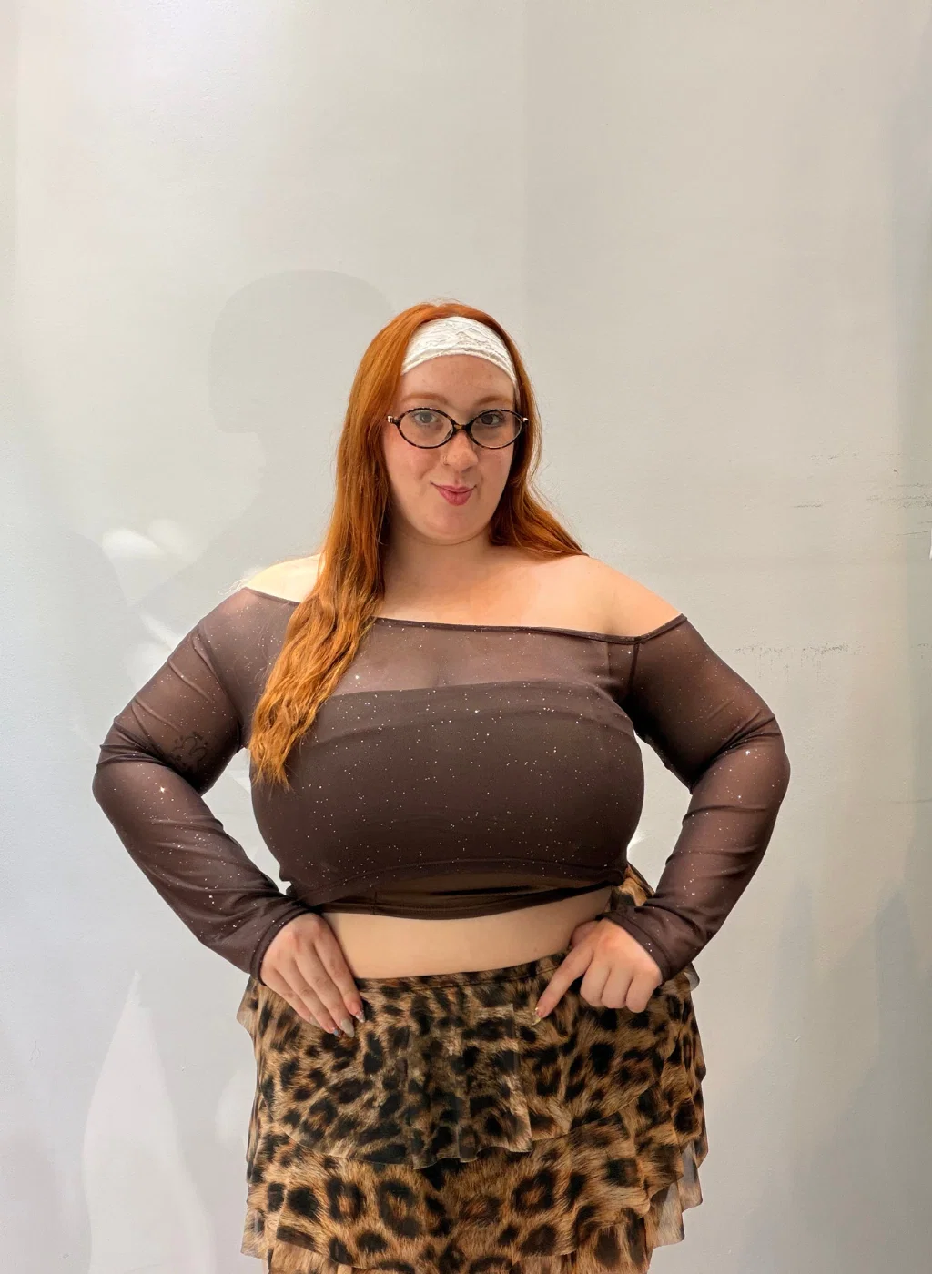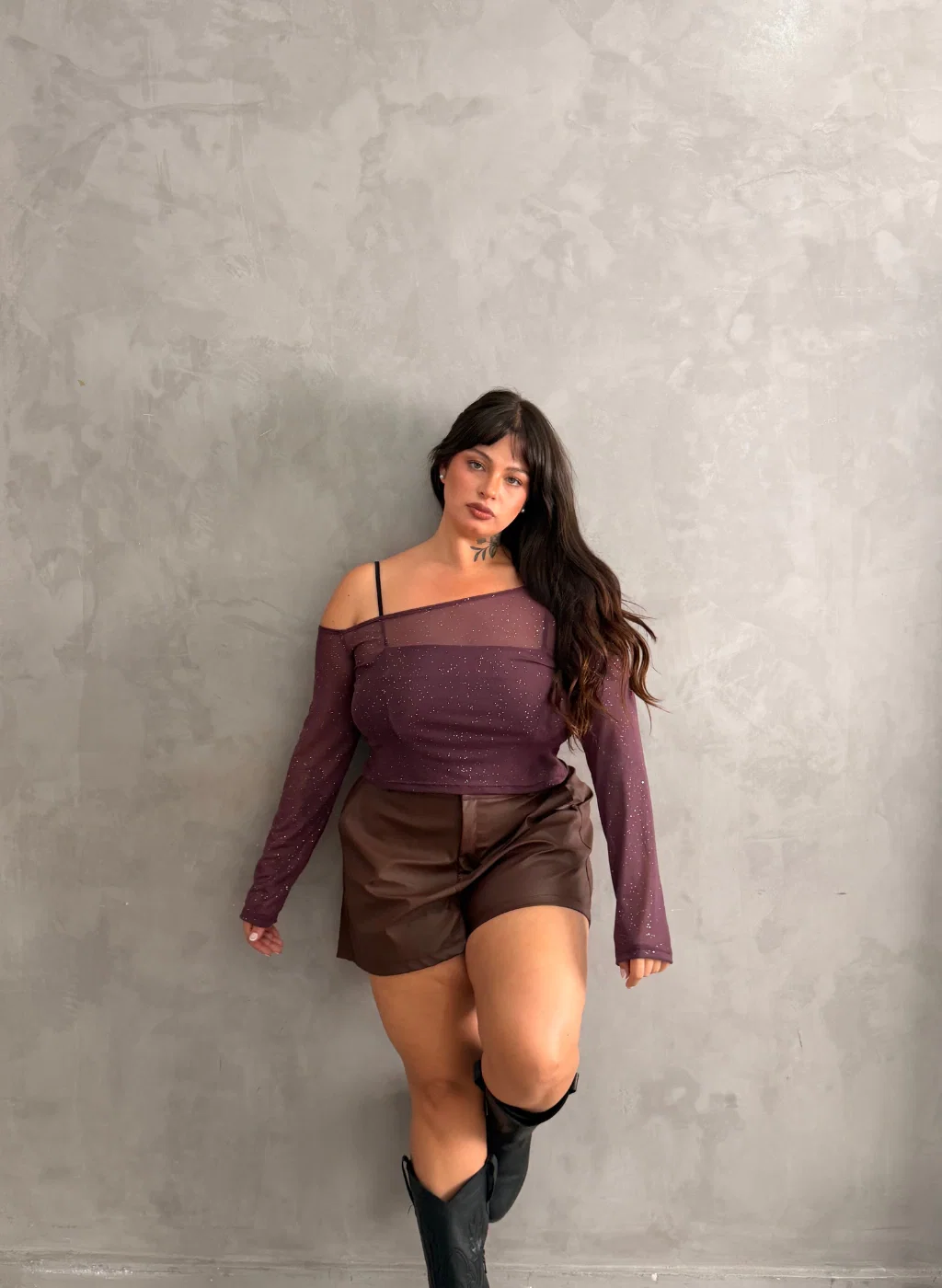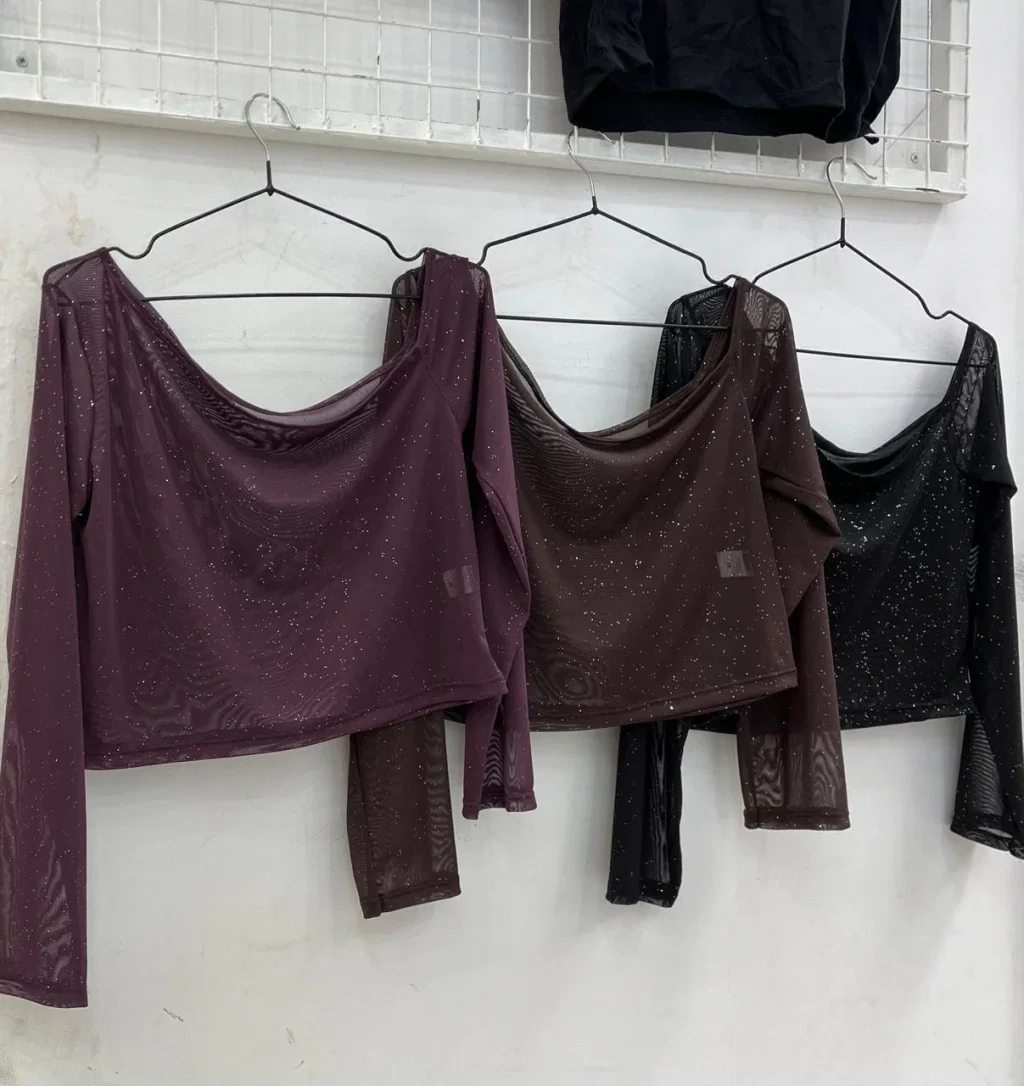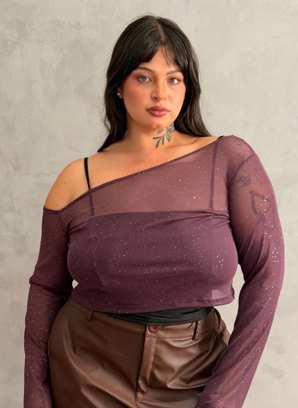 • Top con mangas de tul con cuello bote asimetrico. La modelo viste el XXL.